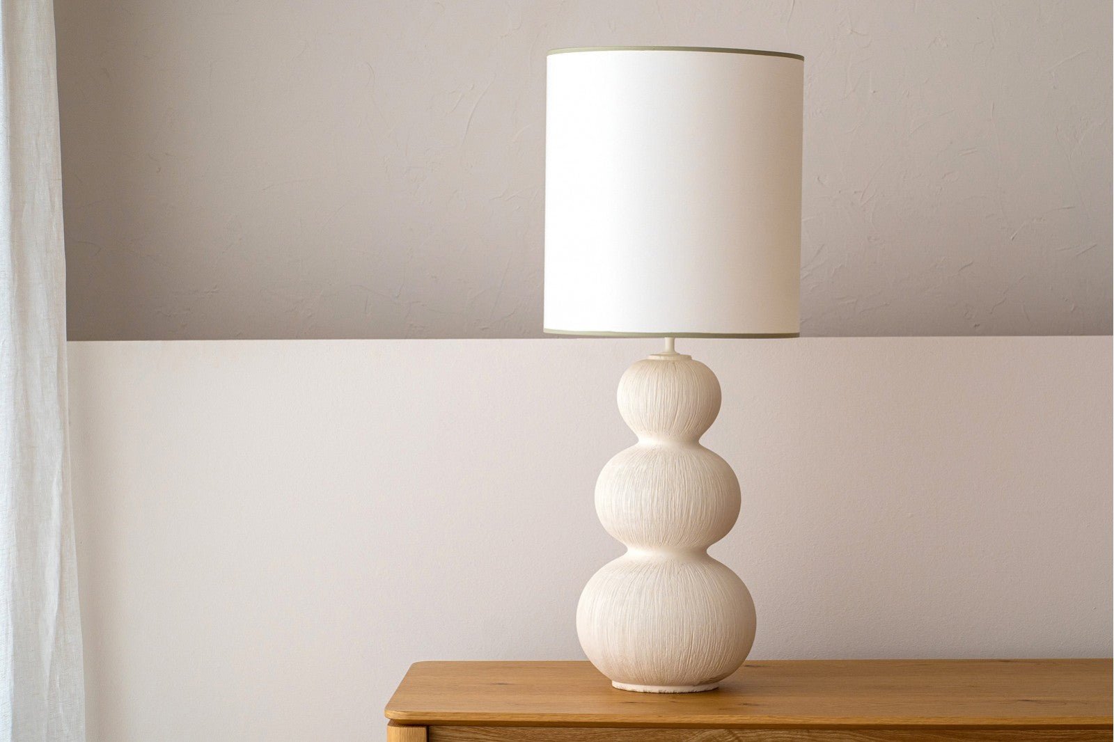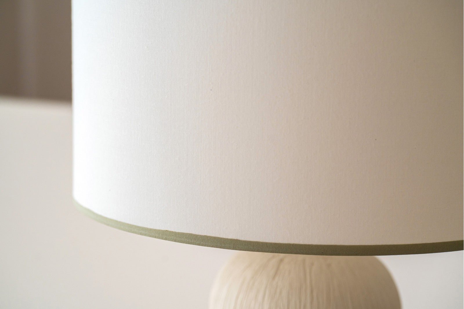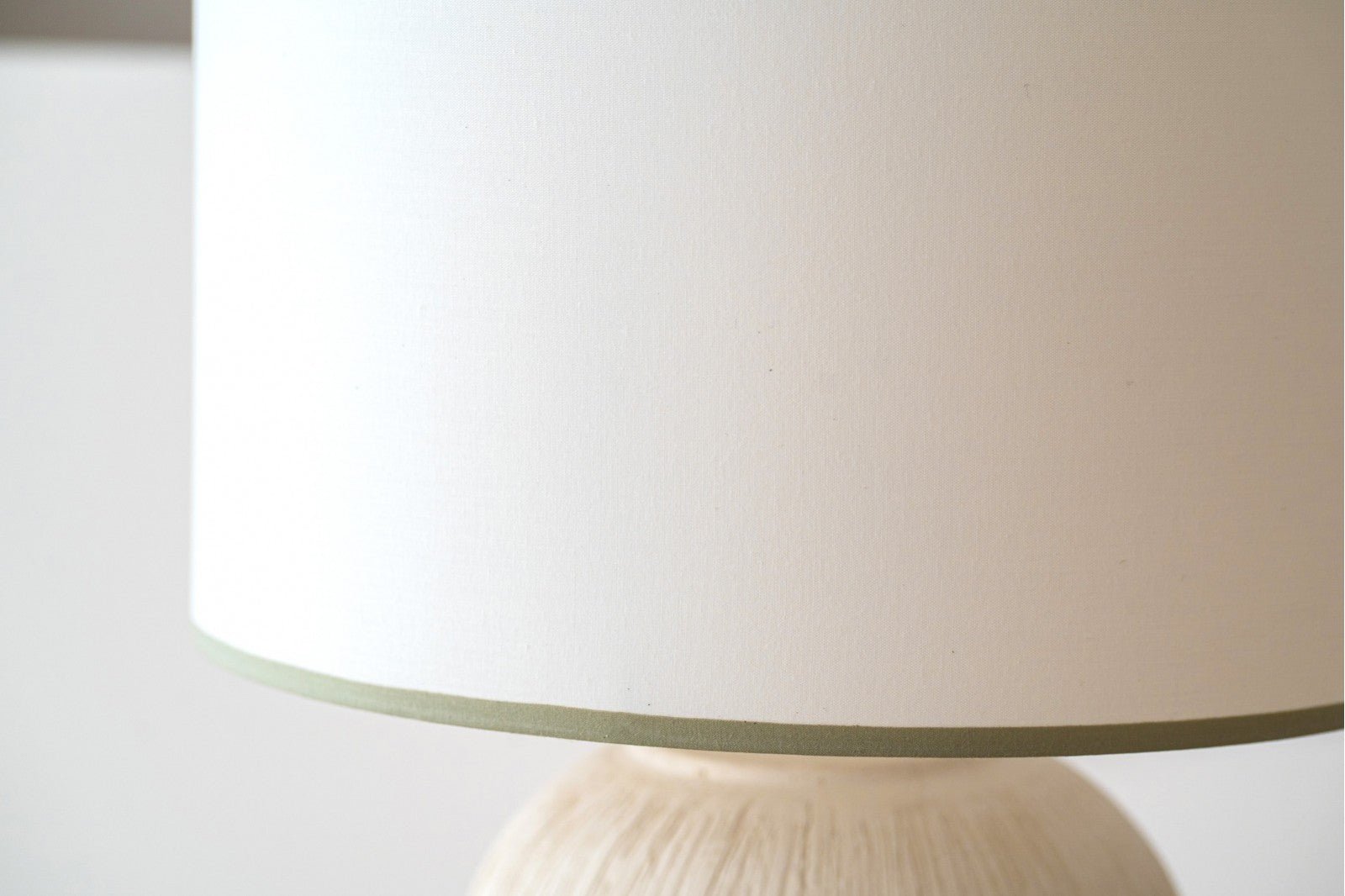 La pantalla de algodón blanco roto, rematada con vivos en tono verde suave en la parte superior e inferior, completa la pieza con un contraste sutil y elegante, convirtiéndola en un punto focal decorativo ideal para espacios contemporáneos o minimalistas.