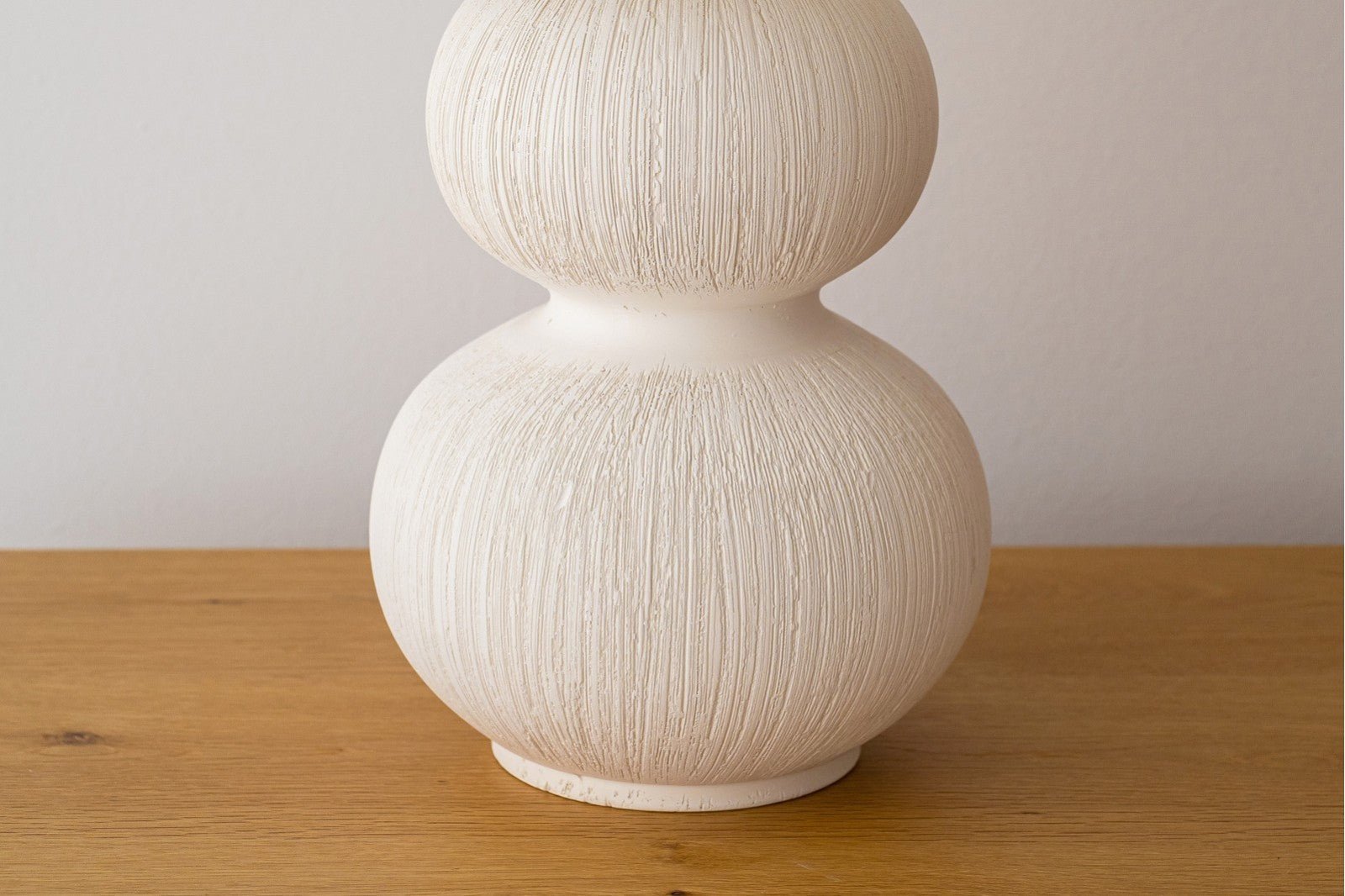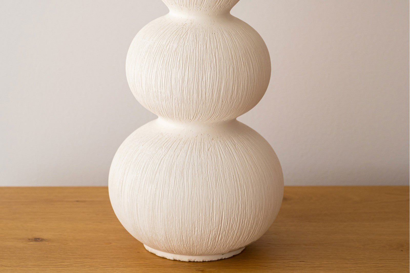 La lámpara Rasé, de la colección Sera, combina diseño escultórico y elegancia minimalista. Su base de cerámica blanca mate está formada por esferas superpuestas de forma decreciente, creando una silueta orgánica y equilibrada. La superficie, surcada con líneas realizadas a mano, aporta un toque artesanal único que hace que cada pieza sea irrepetible.