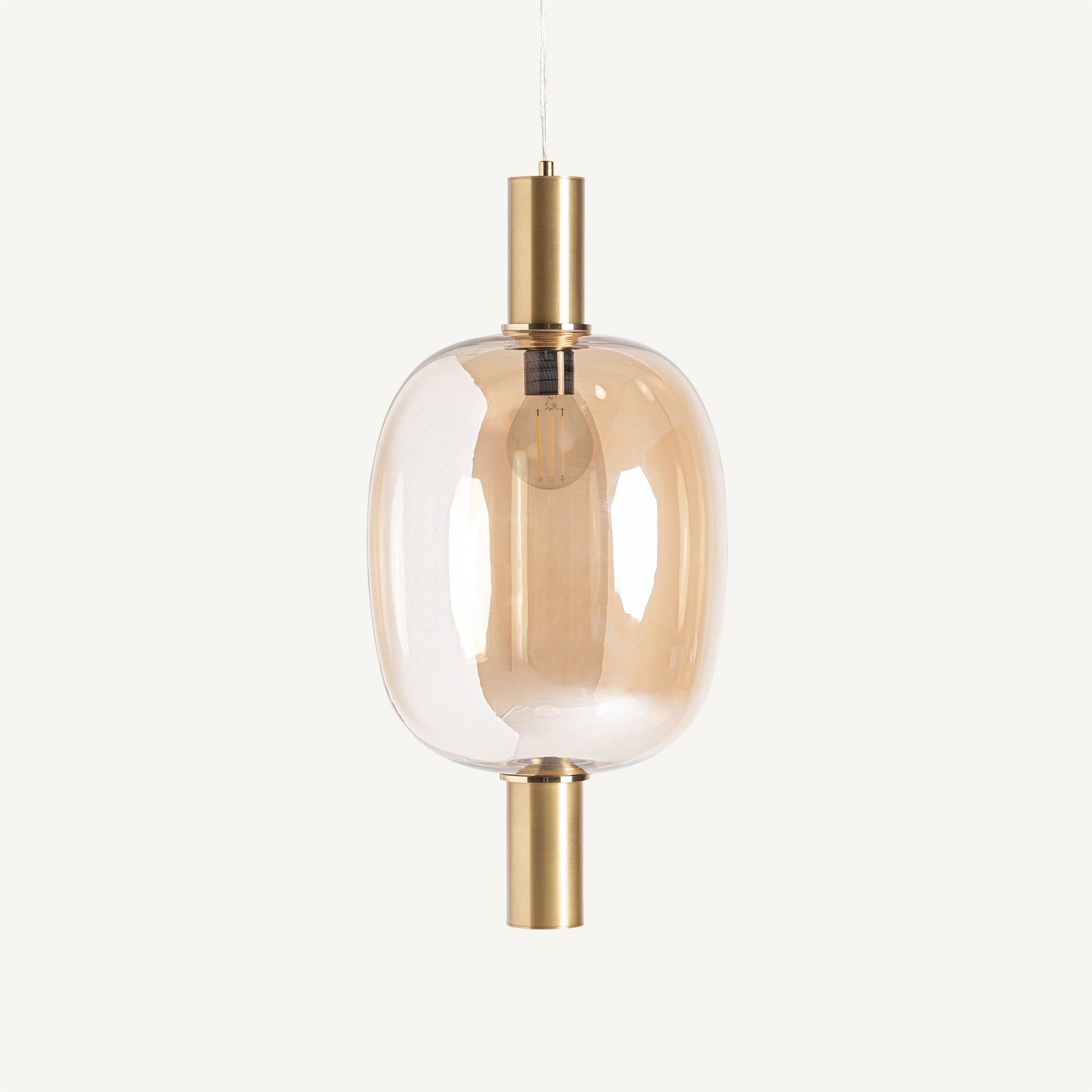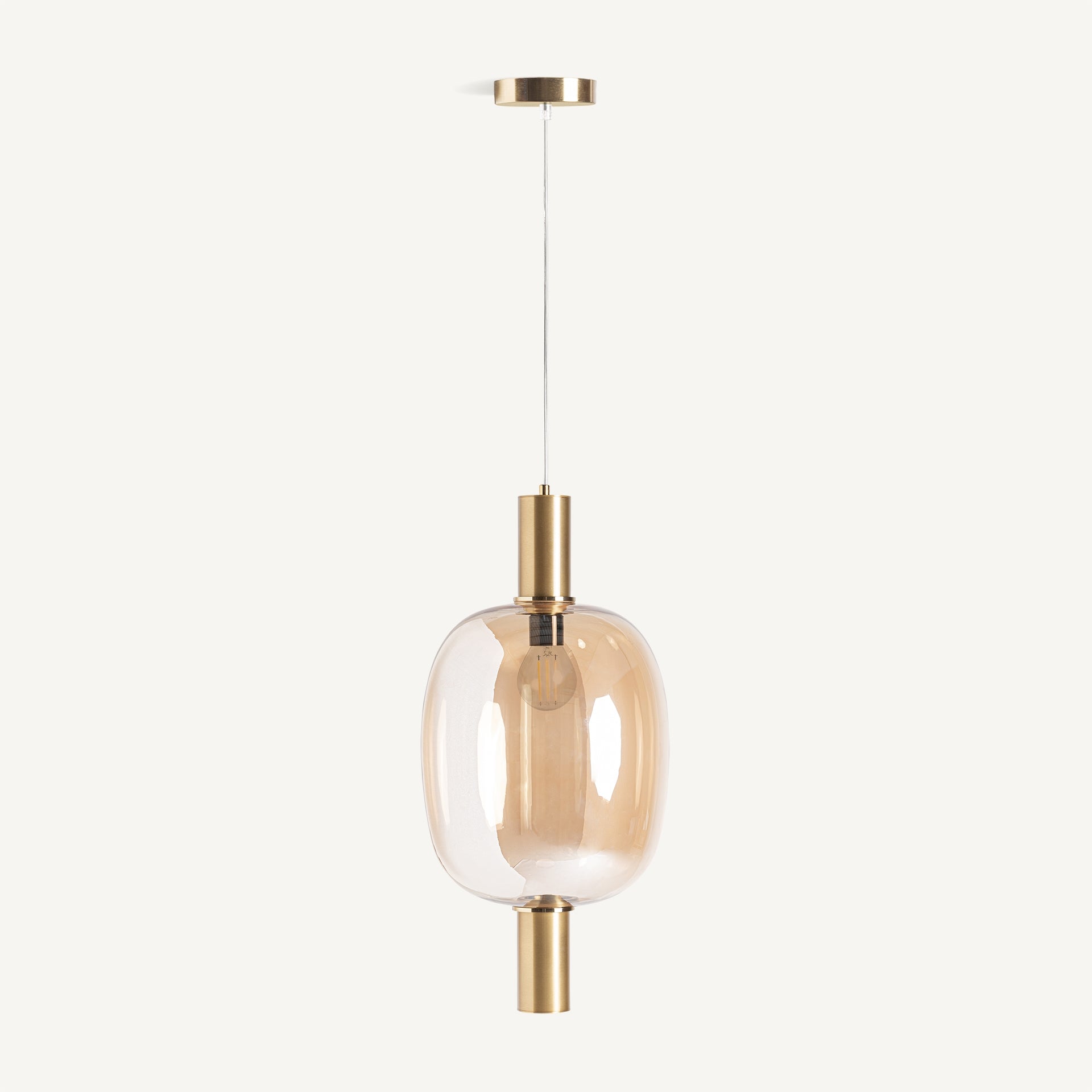 Lámpara de colgar. Fabricado en cristal en color marrón/oro combinado en metal color dorado. Producto desmontable.