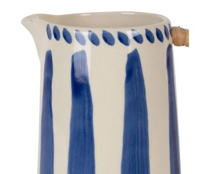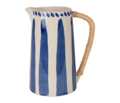 Añade un toque mediterráneo a tu mesa con la Jarra Riviera, una pieza artesanal elaborada en gres de alta calidad con un delicado esmaltado en rayas azules. Su diseño elegante se complementa con un asa de ratán natural, que aporta calidez, textura y un aire rústico sofisticado. Ideal para servir agua, zumos o como florero decorativo, esta jarra combina funcionalidad y estilo con un encanto atemporal.