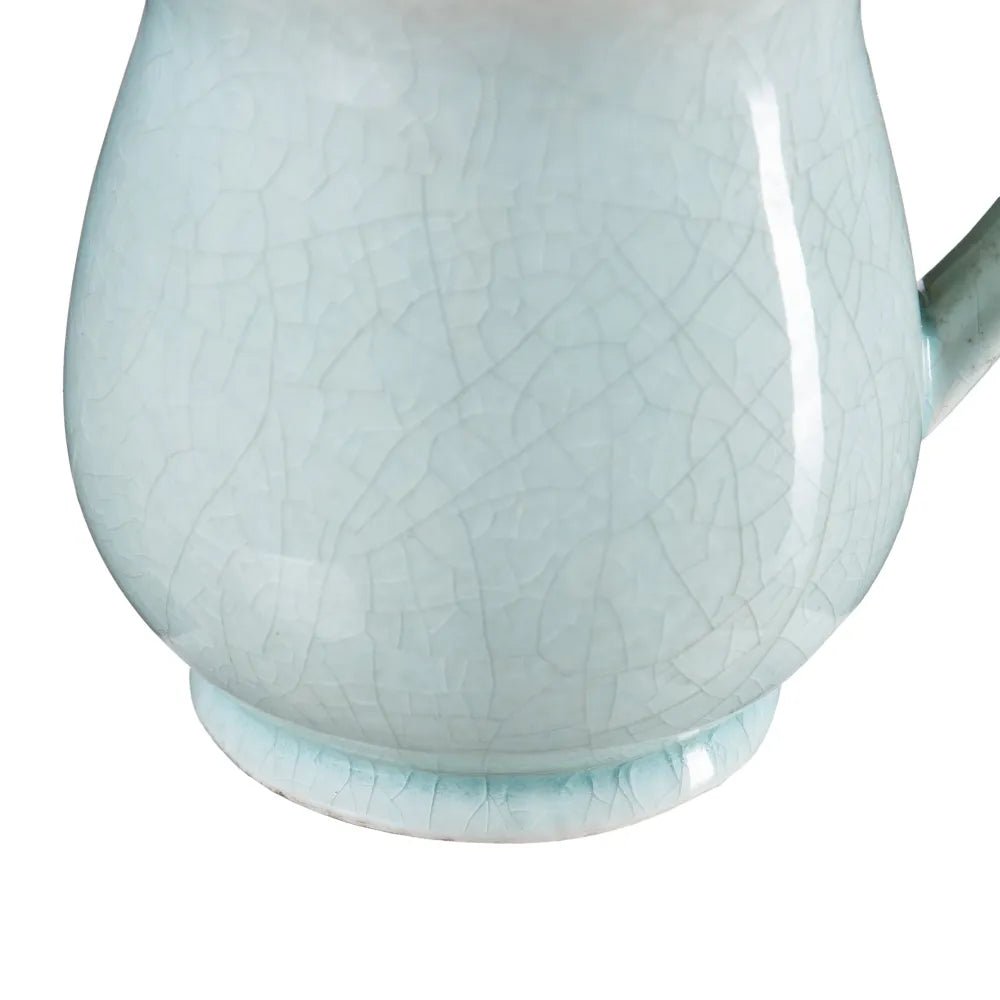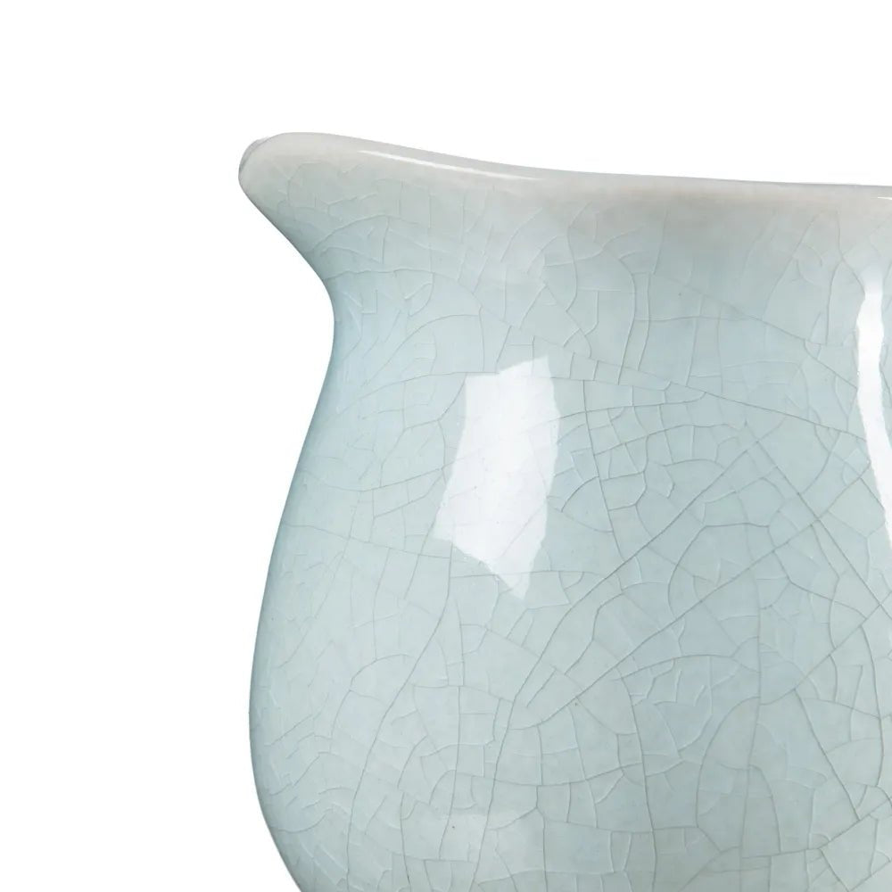 Este encantador jarrón de cerámica en tono turquesa claro destaca por su acabado craquelado y su forma redondeada de inspiración vintage. Su esmalte vidriado con sutiles variaciones de color aporta calidez y personalidad a cualquier rincón.