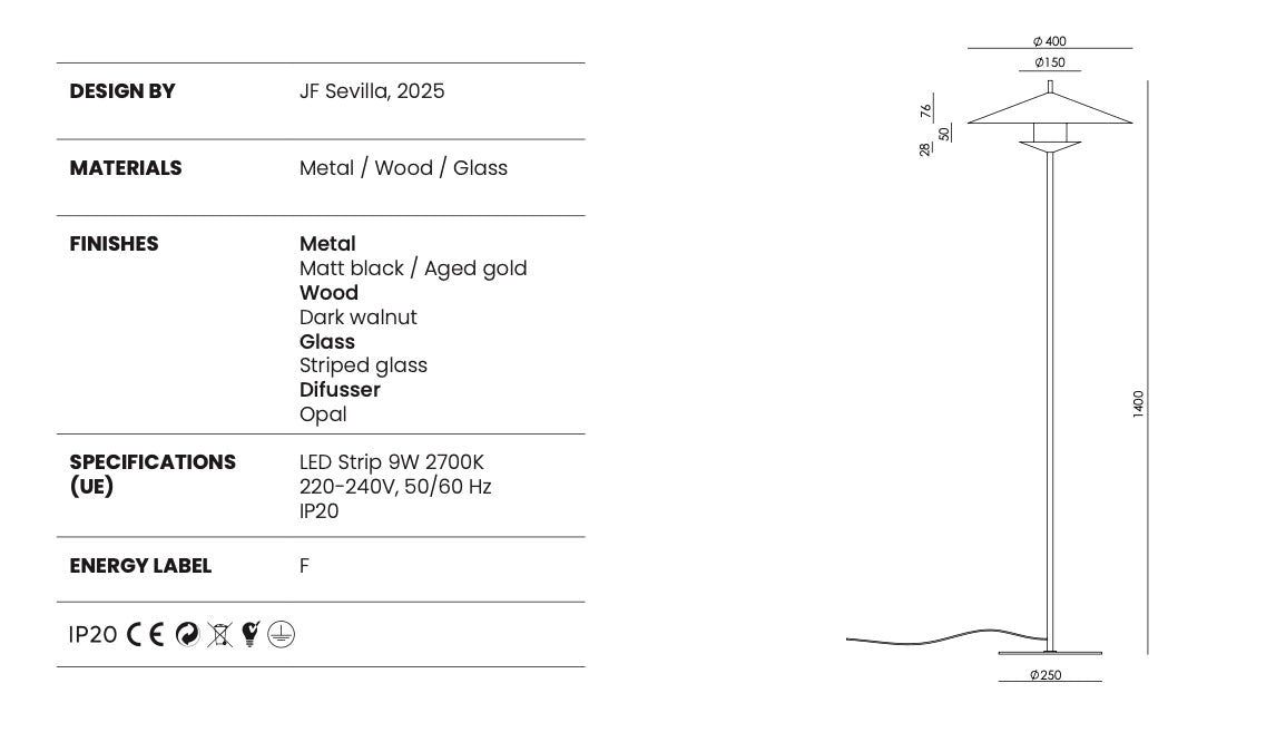 La lámpara de suelo Gehit Pie combina líneas limpias y proporciones elegantes con la textura decorativa del cristal estriado, creando una iluminación ambiental cálida y acogedora. Su diseño vertical estilizado la convierte en una pieza perfecta para acompañar sofás, butacas o rincones de lectura sin recargar el espacio.