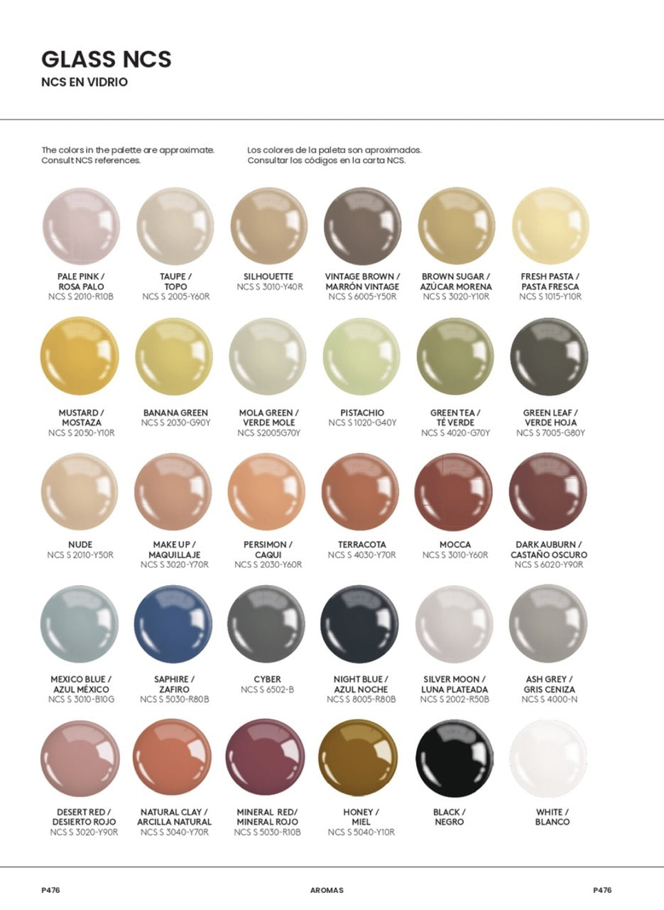 Los acabados del metal pueden elegirse en distintos colores y la base de cristal debe seleccionarse según la paleta disponible. También es posible solicitar un acabado personalizado fuera de paleta.