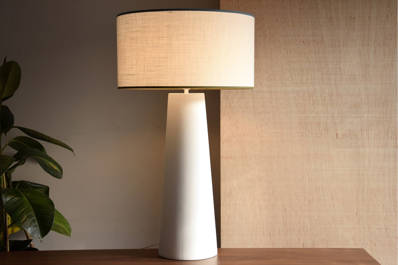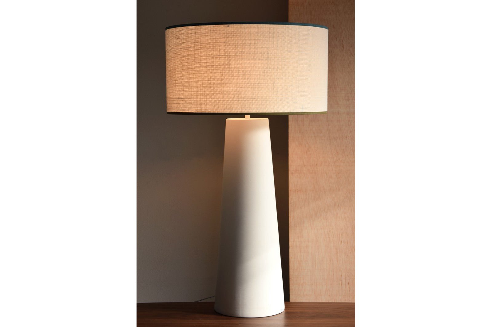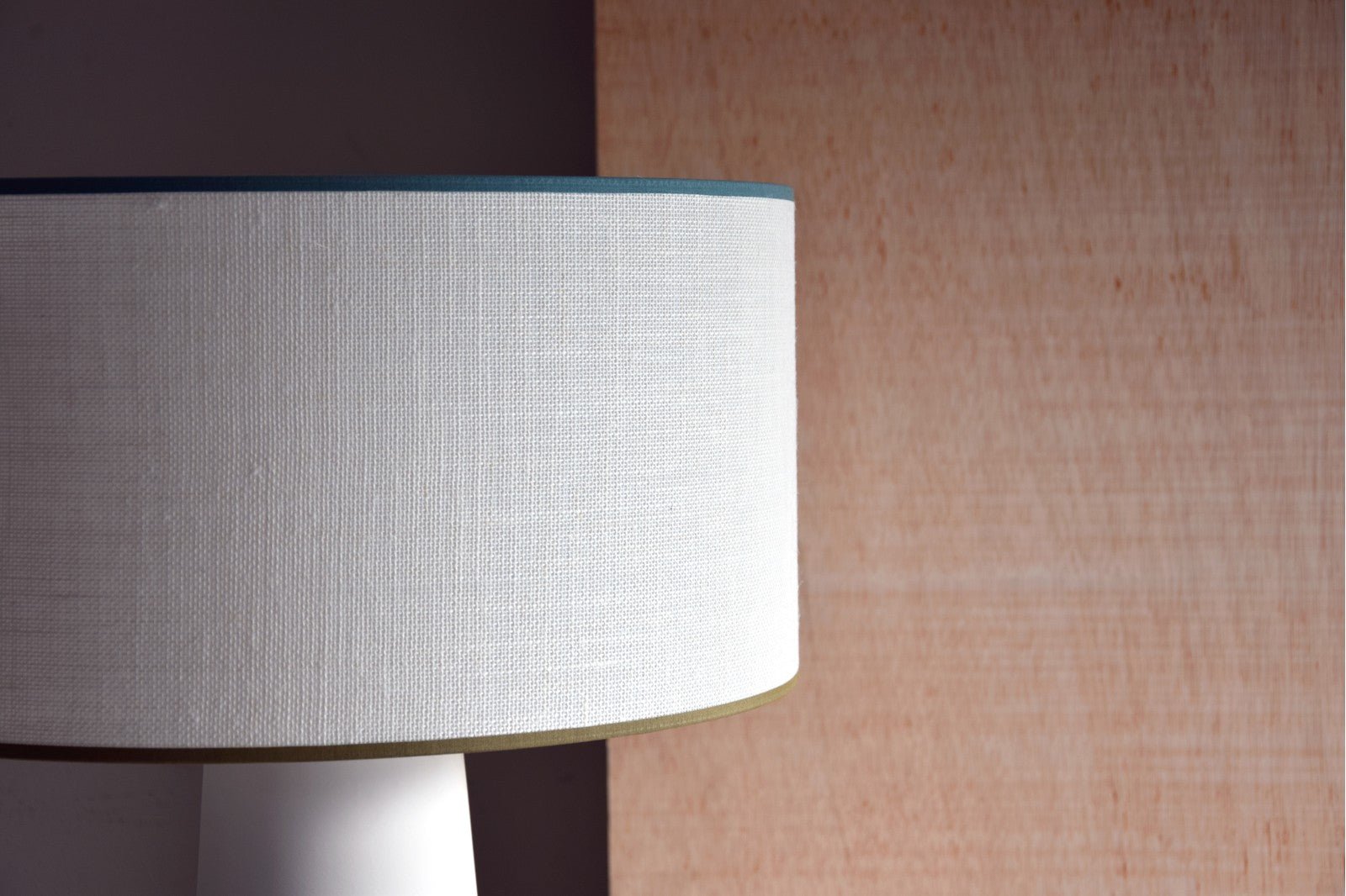 Lámpara de sobremesa Ovar fabricada en pasta cerámica con acabado natural mate con pantalla cilíndrica realizada en arpillera de tono marfil con vivo superior en azul e inferior en marrón.