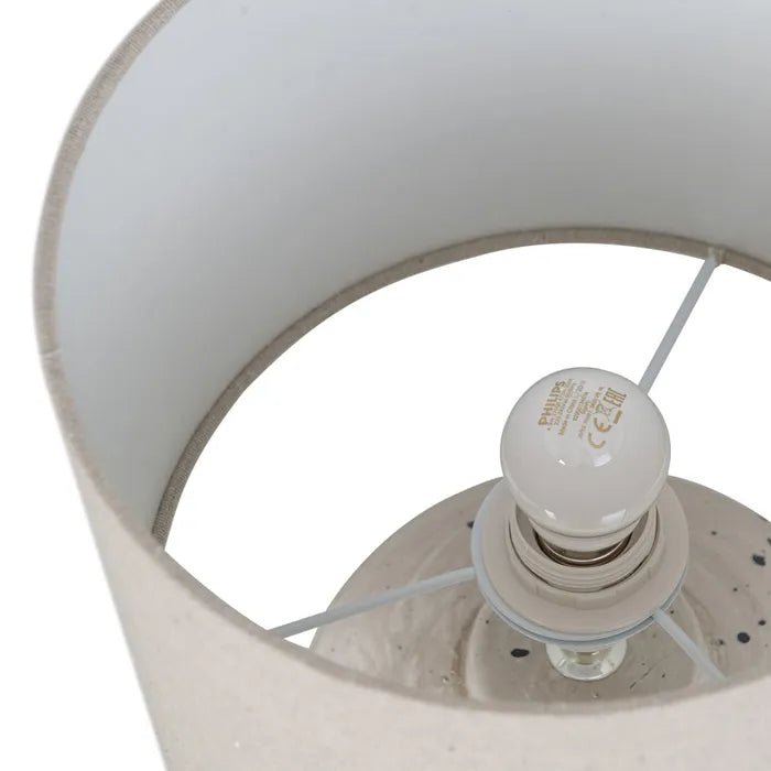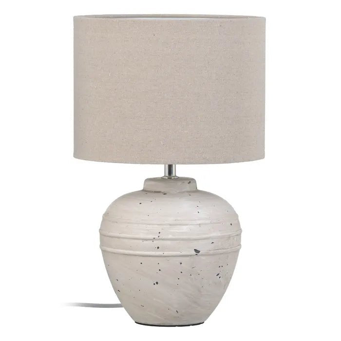 Lámpara de sobremesa Villora fabricada en cerámica en color gris con pantalla de lino incluida.