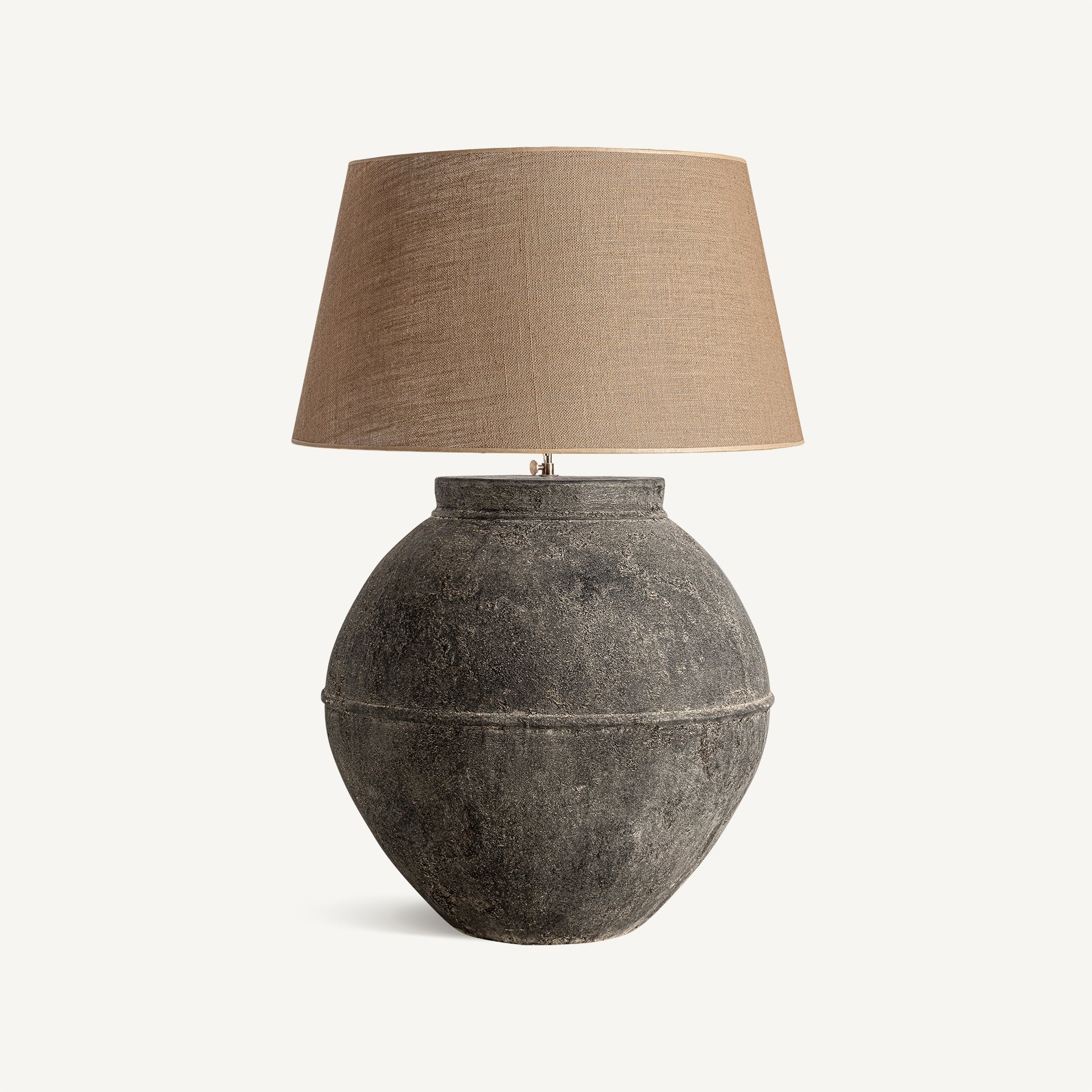 Lámpara de sobremesa, en color gris envejecido, de estilo contemporáneo. Fabricado en terracota, combinado con la pantalla de yute.