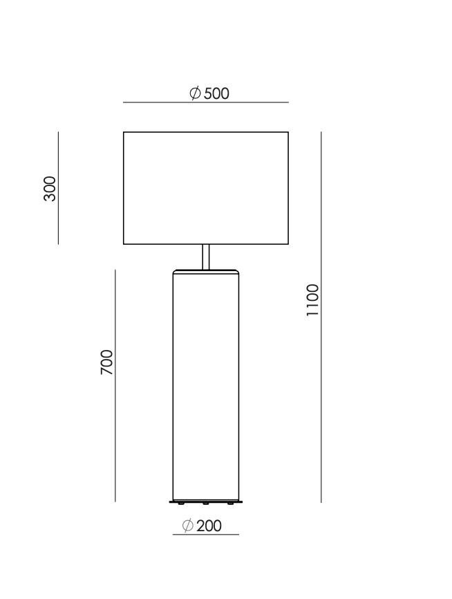 Diámetro (sin pantalla): Ø20 cm. Diámetro (con pantalla): Ø50 cm. Alto de la base: 70cm. Alto total: 110 cm
