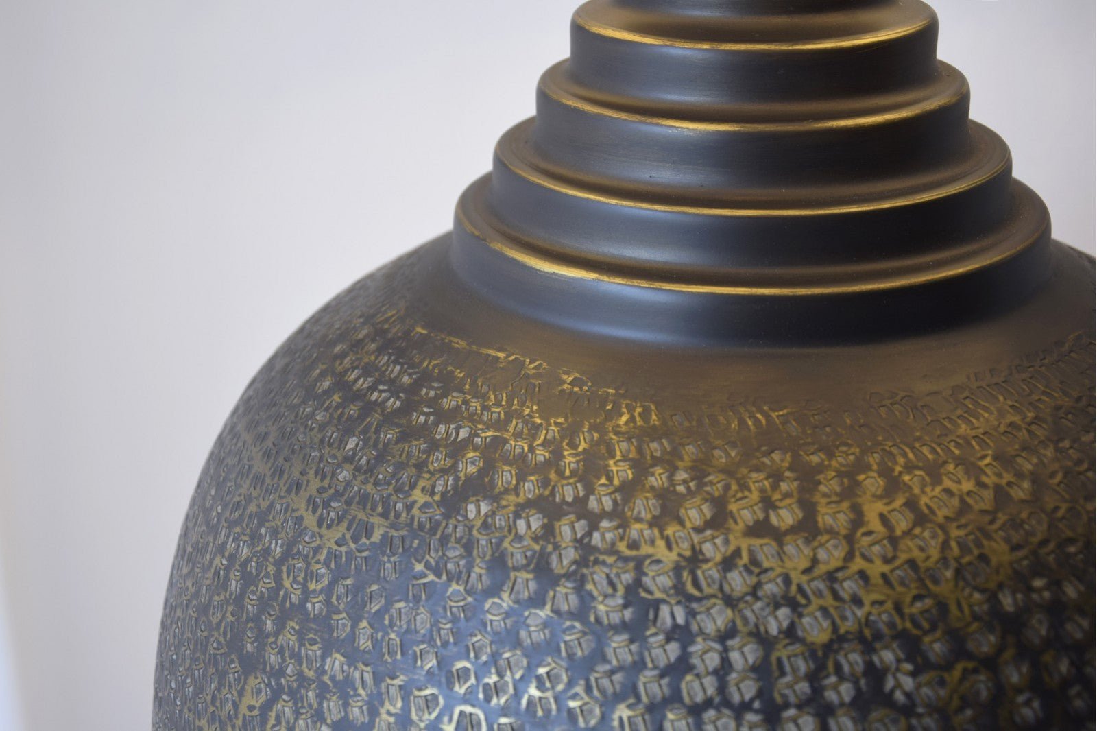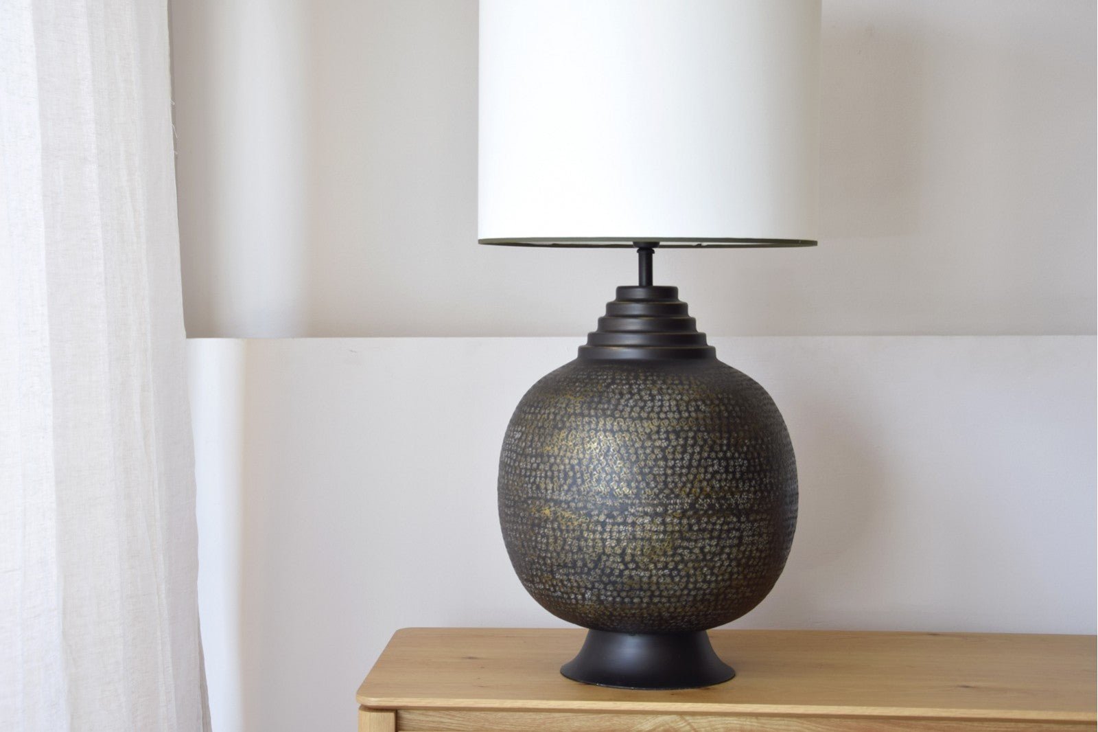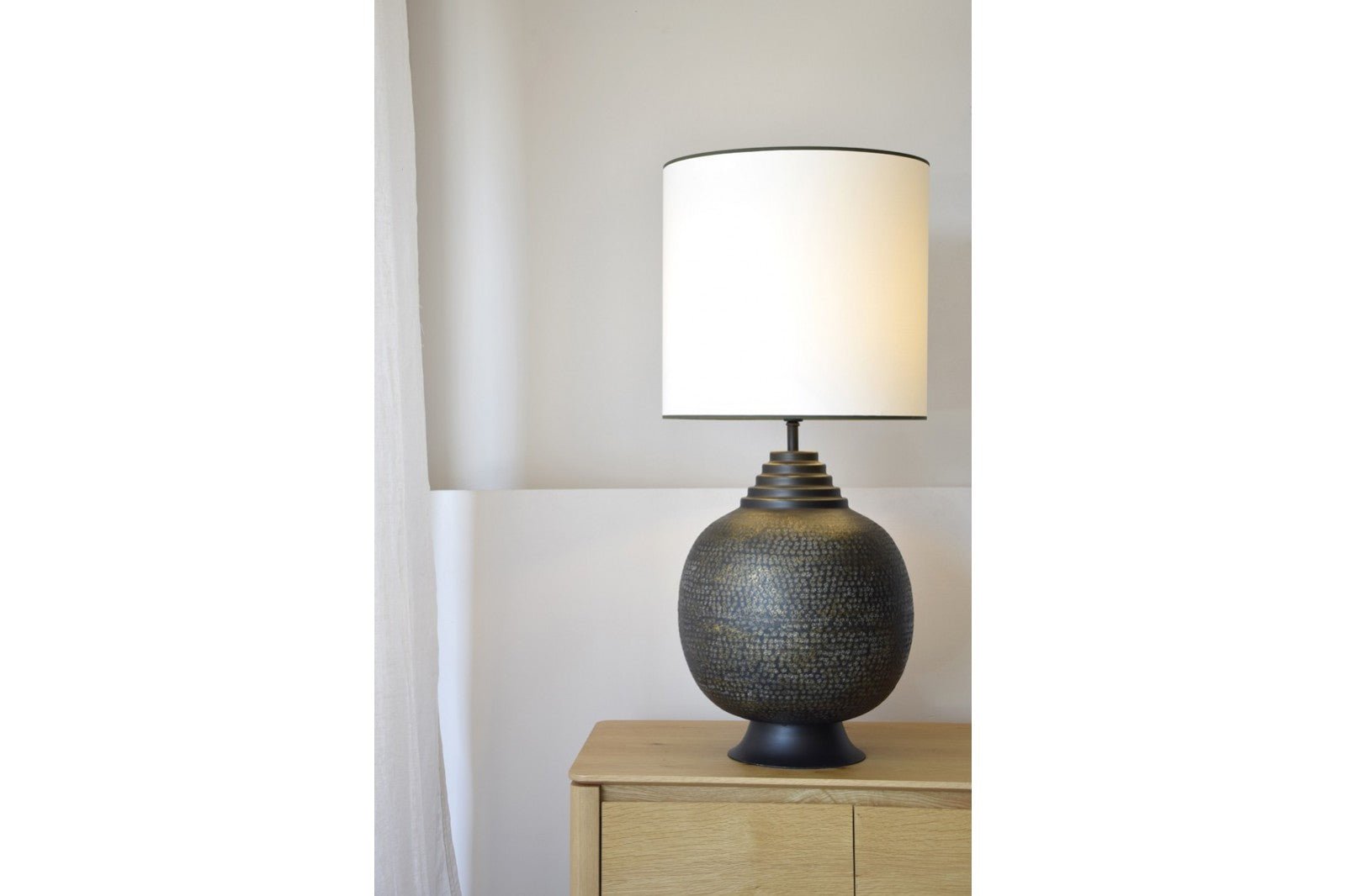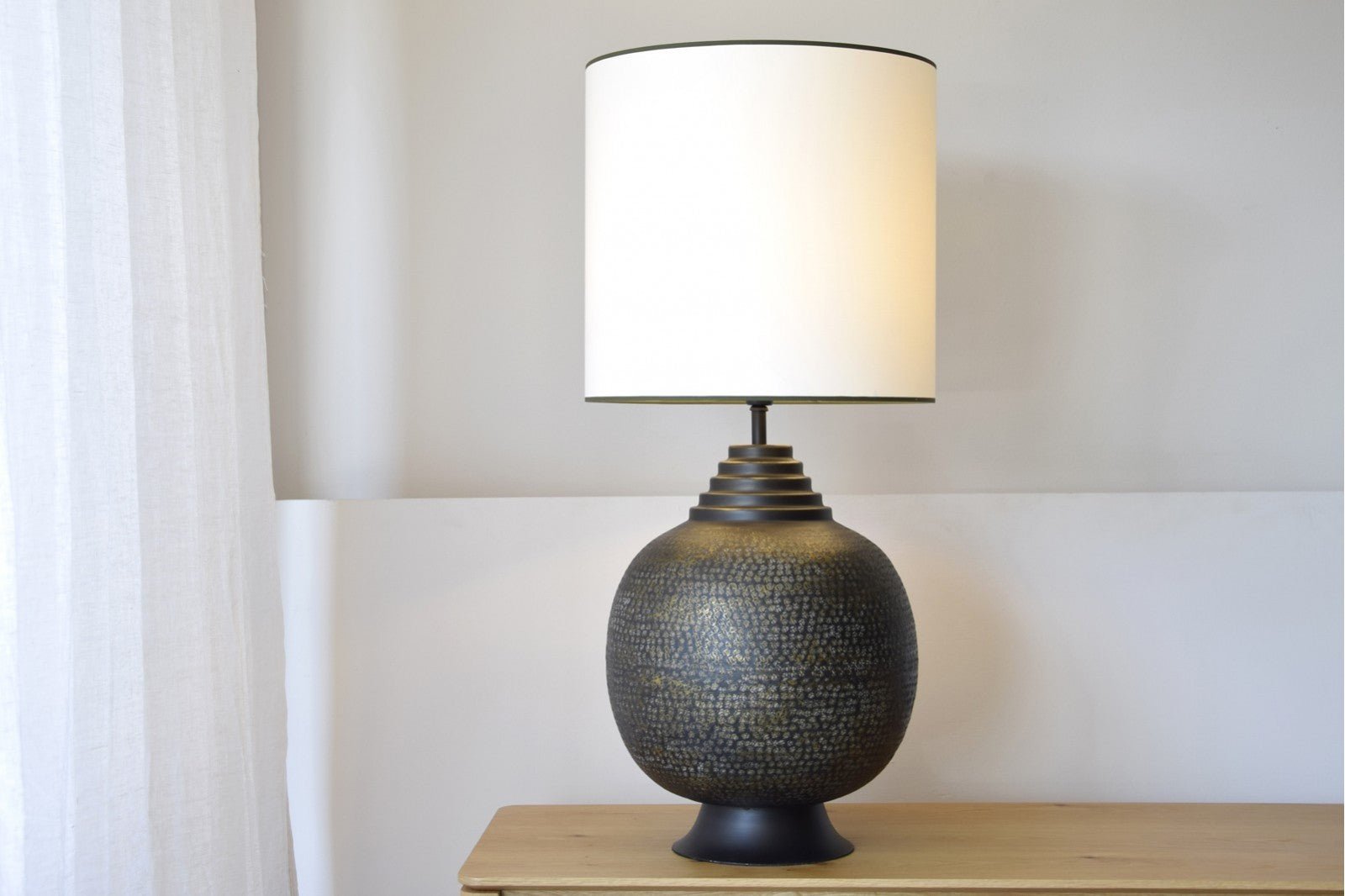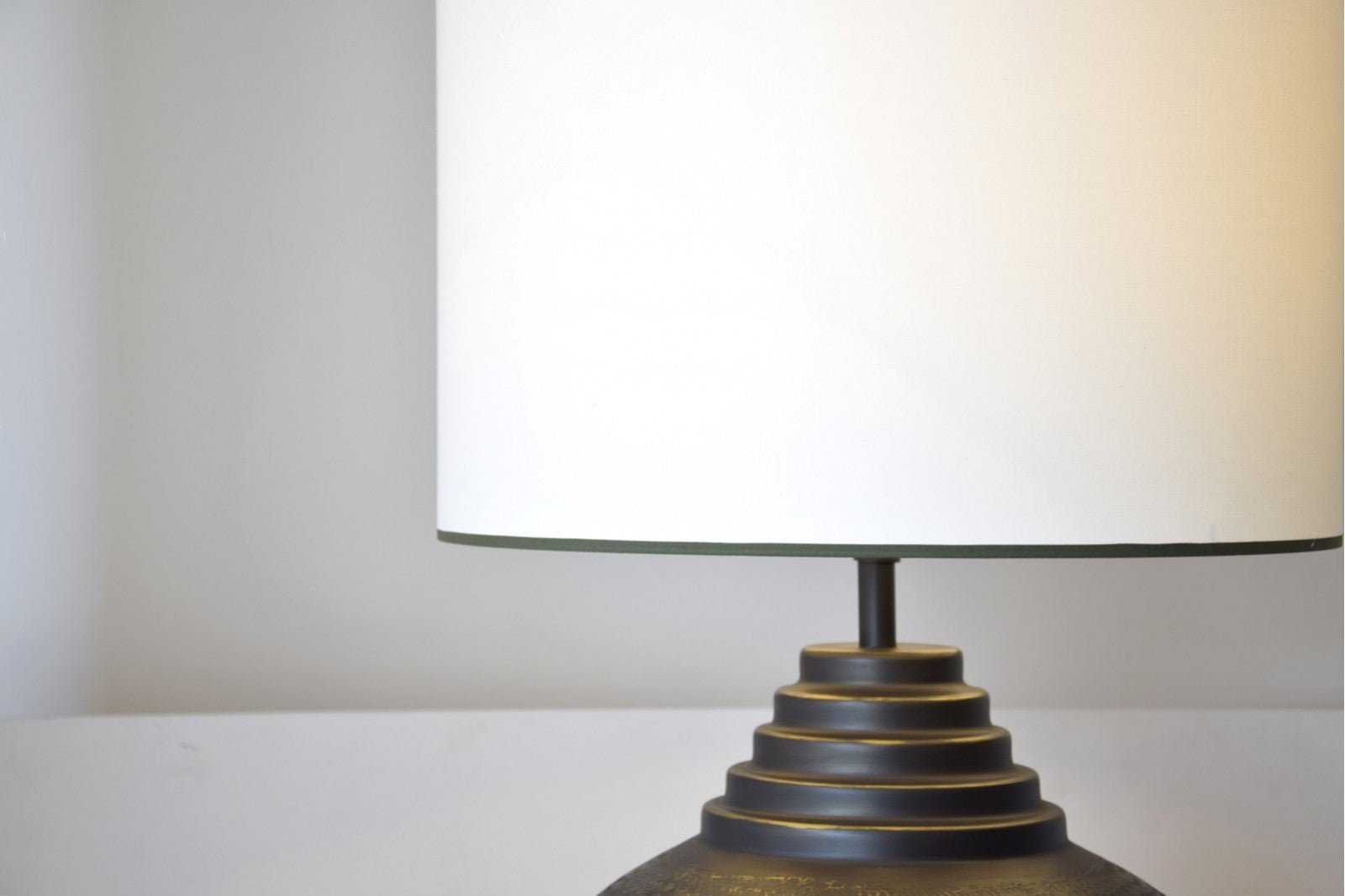 Lámpara se sobremesa realizada en aluminio y acabado en color negro y detalles en oro viejo, el aluminio es trabajado a mano de forma artesanal. La pantalla cilíndrica está realizada en algodón blanco roto con vivo inferior y superior en verde oscuro.