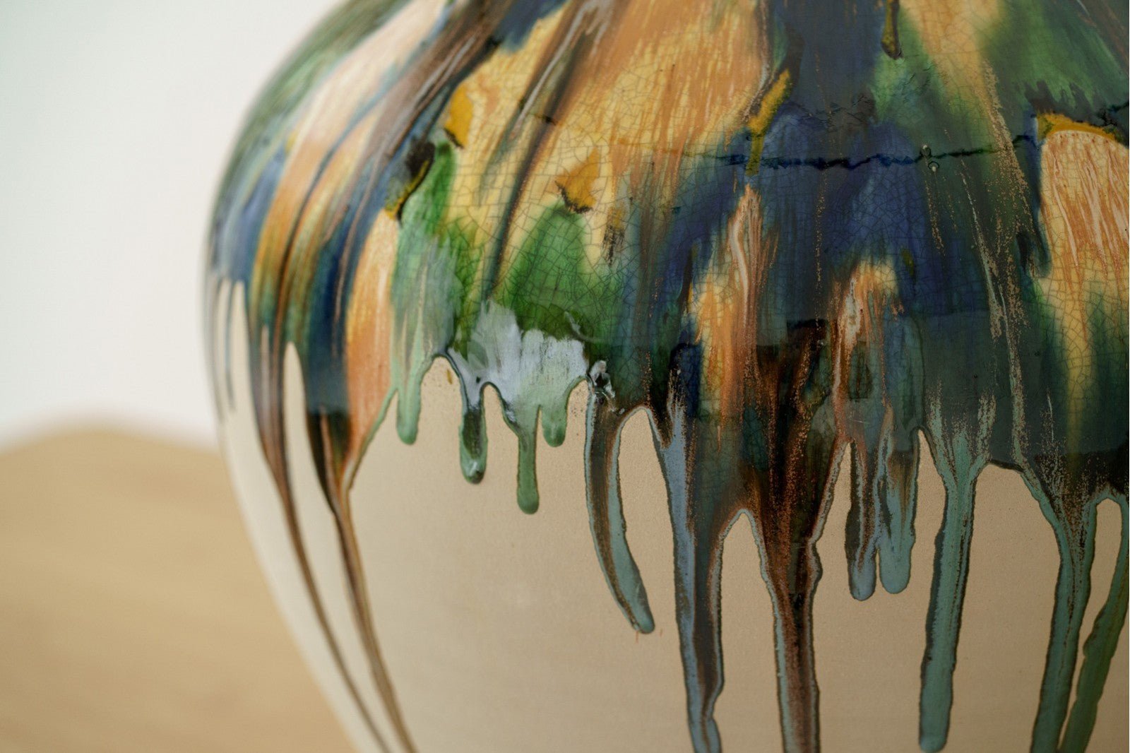 Lámpara de sobremesa de cerámica realizada a mano inspirada en un bosque por sus tonos en verdes azules y ocres. La pantalla es de algodón de color blanco roto con vivos en verde musgo.
