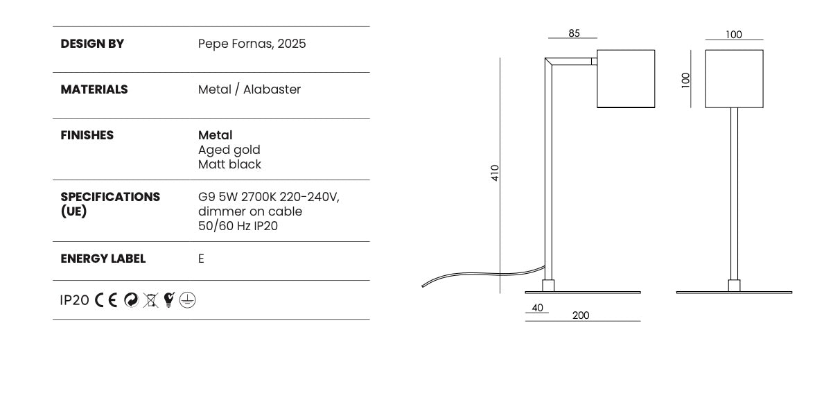 La lámpara de sobremesa Cubic es una pieza decorativa de líneas elegantes y diseño atemporal, ideal para aportar una iluminación cálida y sofisticada. Disponible en oro envejecido o negro mate , su estructura se combina con una tulipa de alabastro que difunde la luz de forma suave y envolvente.