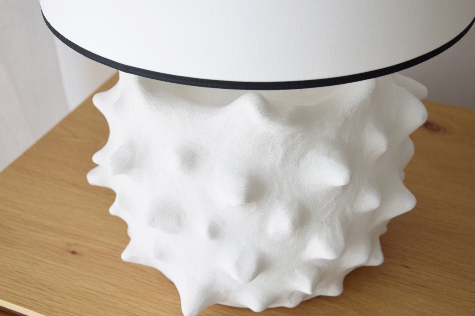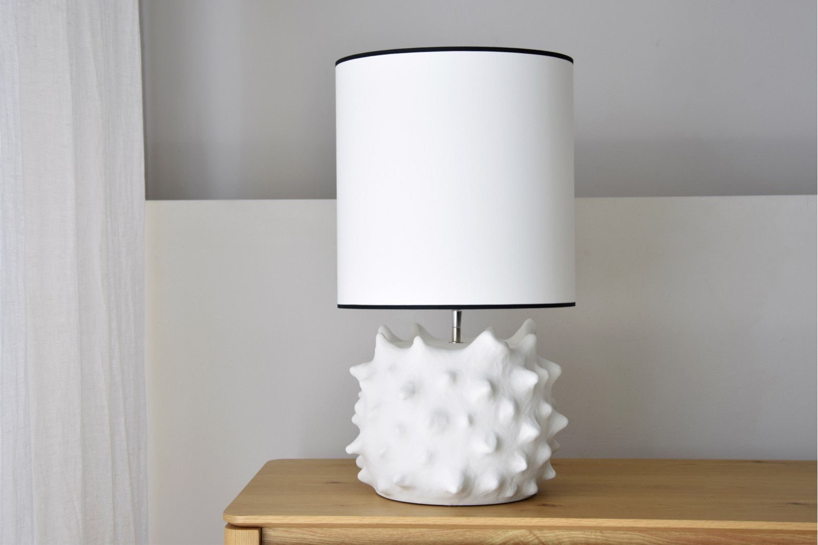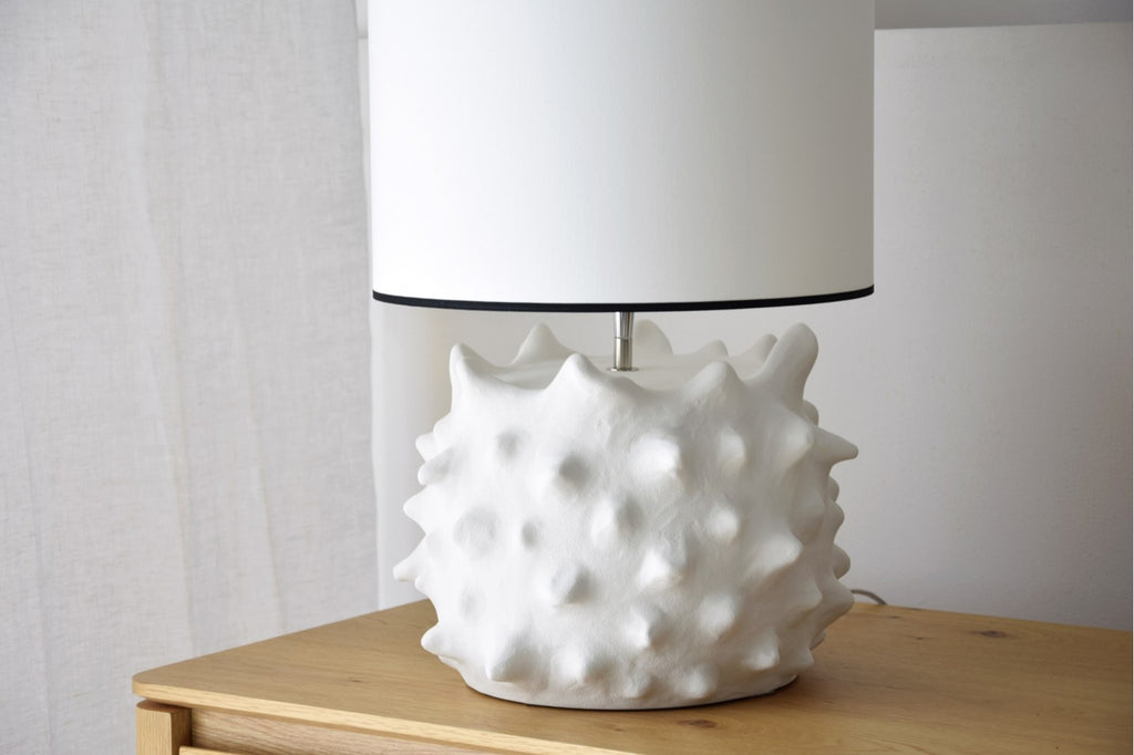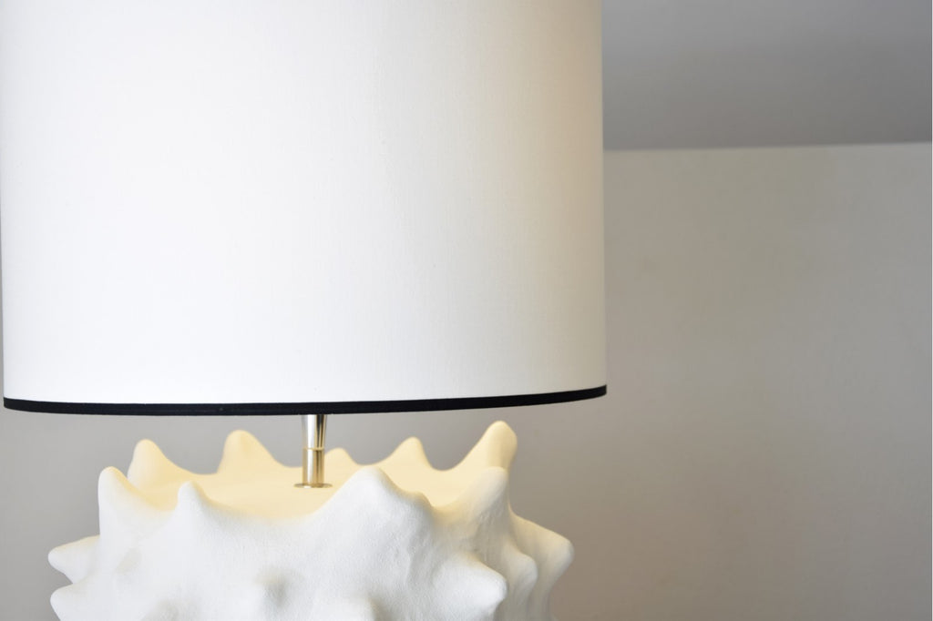 Lámpara de sobremesa de cerámica en color blanco roto, destaca su relieve en picos tan llamativo. Un diseño sorprendente que alegrara su estancia. La pantalla cilíndrica en algodón blanco roto y vivo en negro.