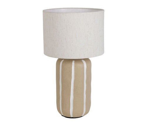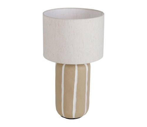 Lámpara de sobremesa fabricada en cerámica y lino con rayas en la base de color beige y blanco con un diseño elegante y atemporal que se adapta a distintos estilos de interior. Su luz cálida y suave crea un ambiente acogedor, ideal para salones, dormitorios o espacios de lectura. Una pieza versátil que combina funcionalidad y estilo, aportando un toque de sofisticación discreta al hogar.