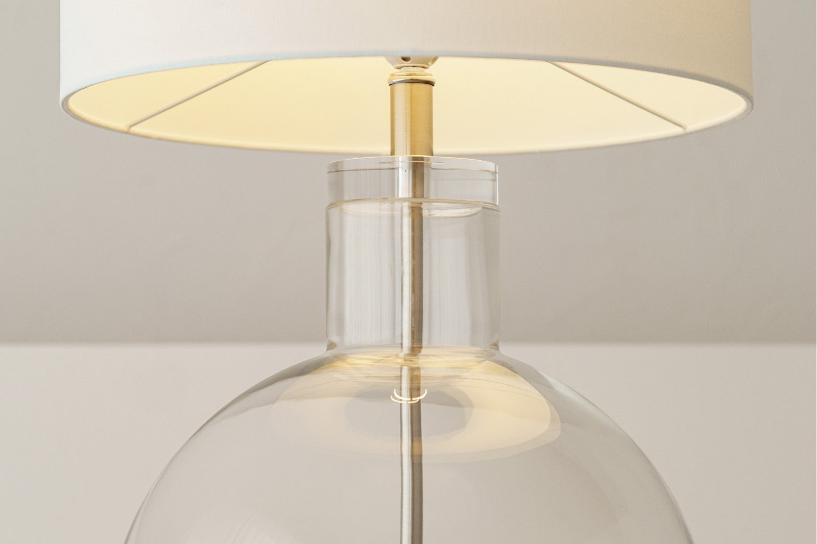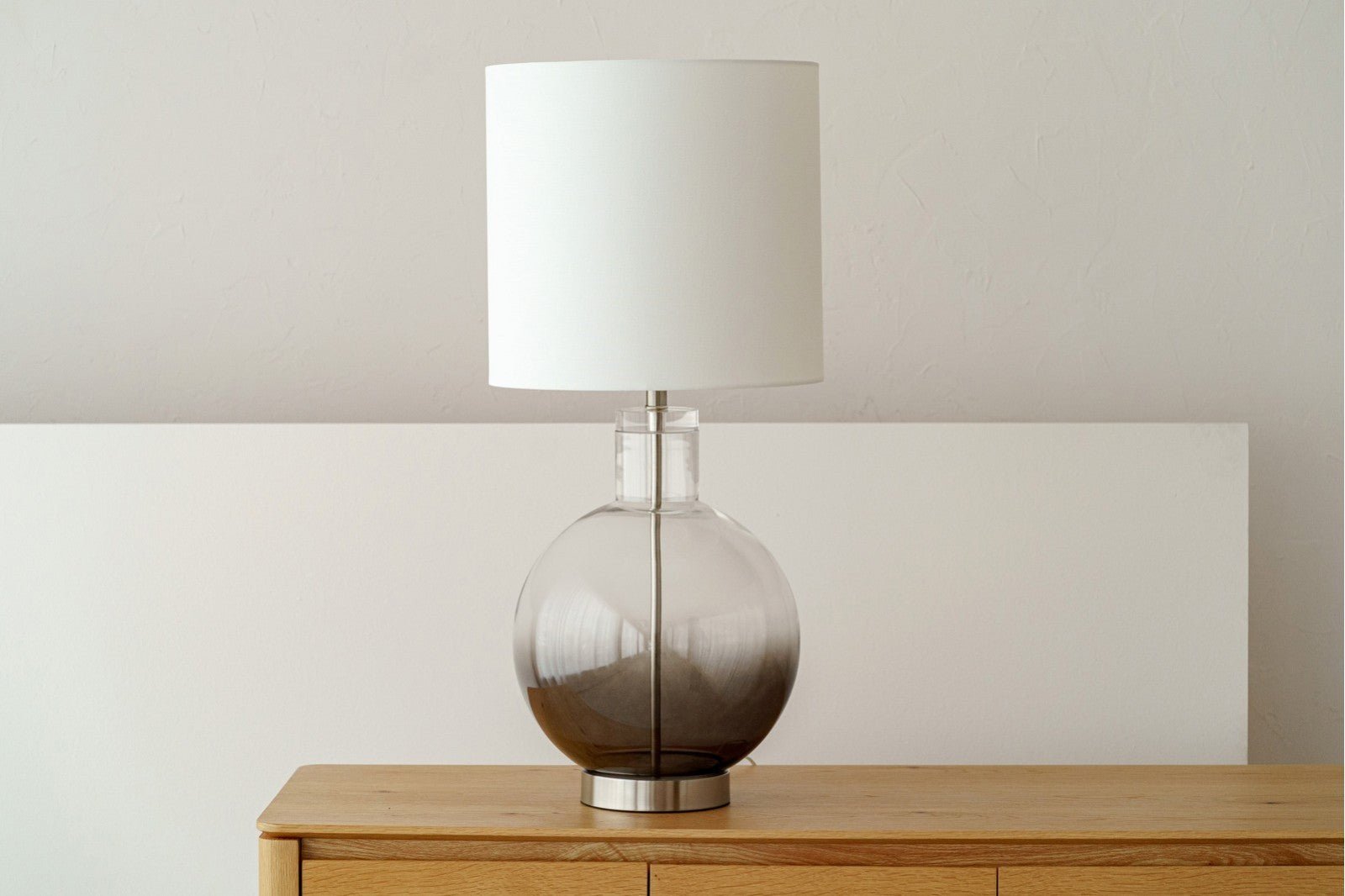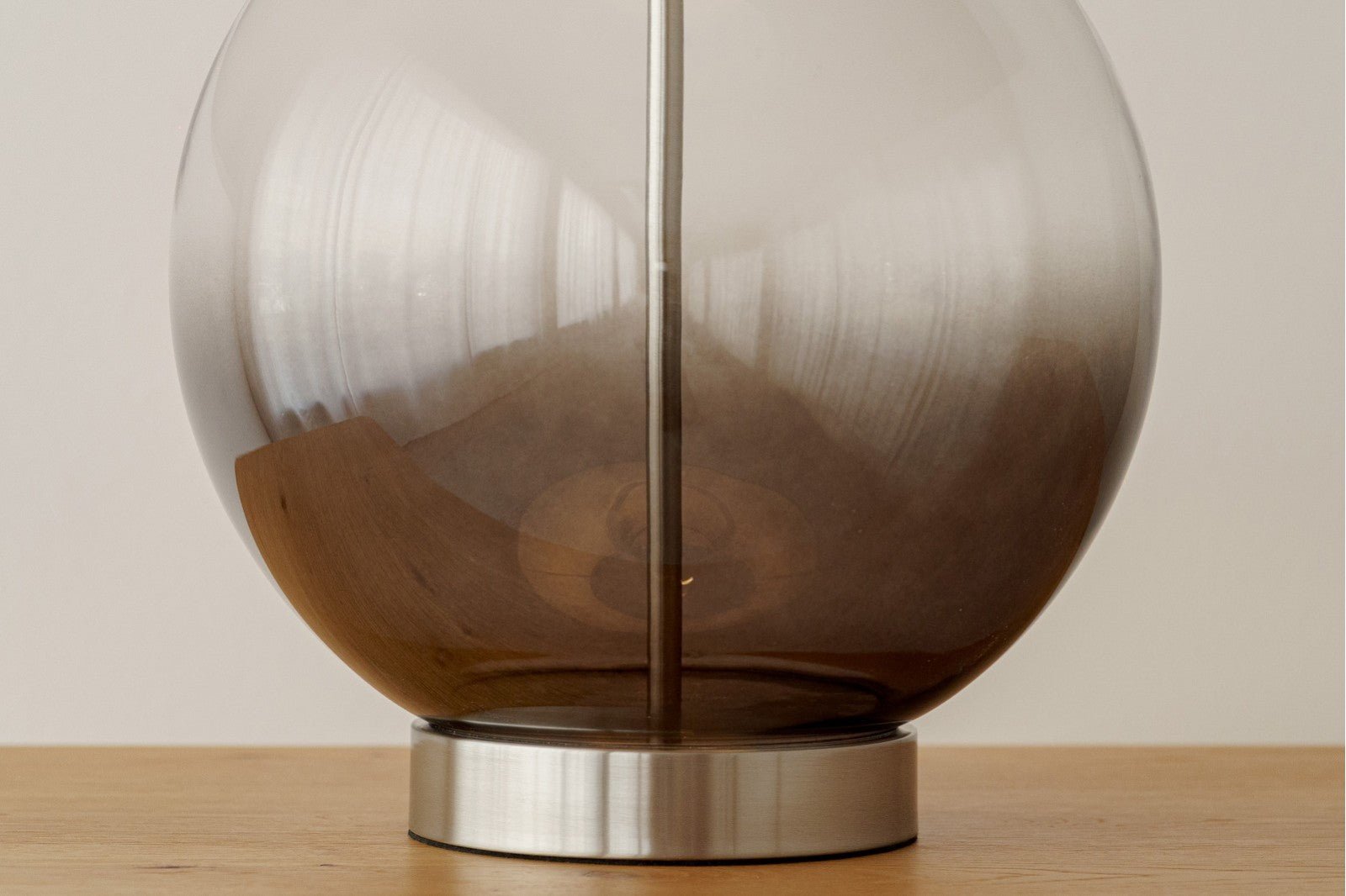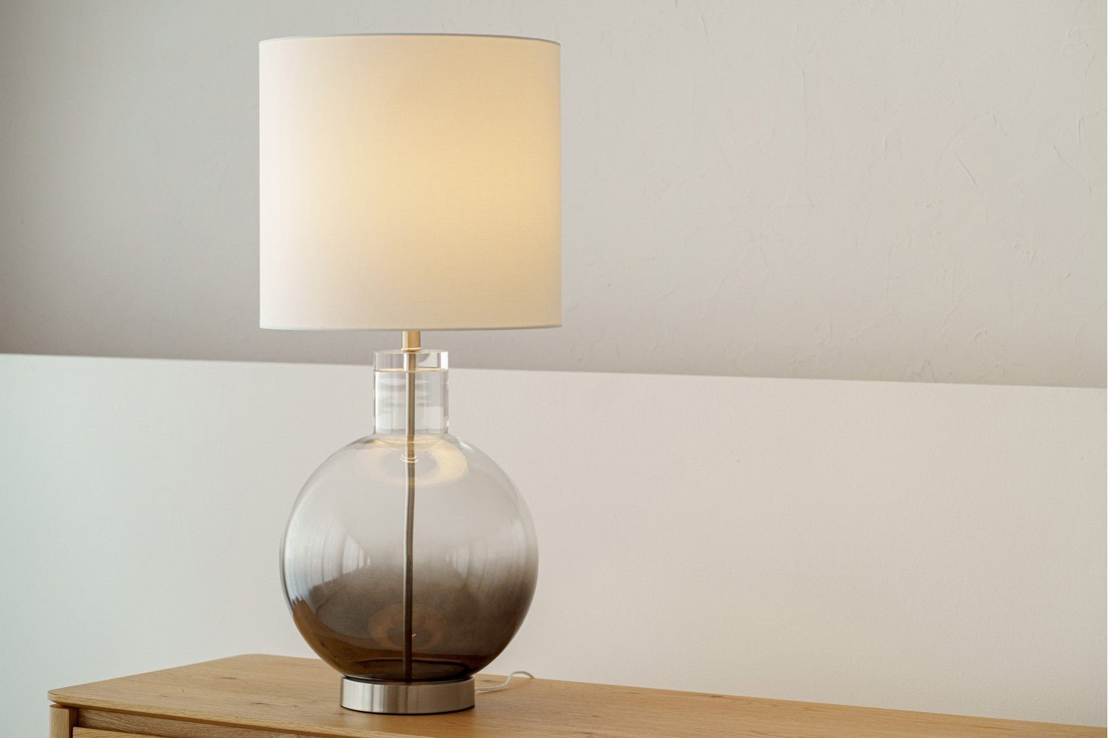Lámpara de sobremesa realizada en vidrio de lineas redondeadas en color gris de efecto ahumado, base en metal acabado níquel mate. La pantalla está realizada en lino blanco.