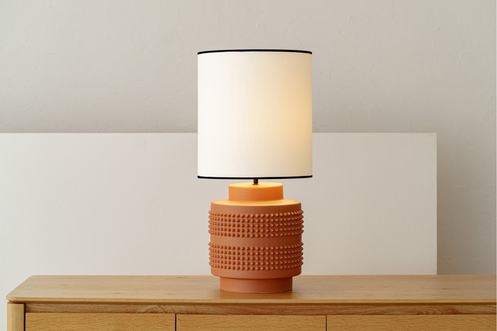 Lámpara de sobremesa realizada en cerámica de color teja oscuro en su redondeada destaca su franja de relieve en picos. La pantalla es de forma cilíndrica. La pantalla cilíndrica realizada en algodón blanco roto con vivo en negro.