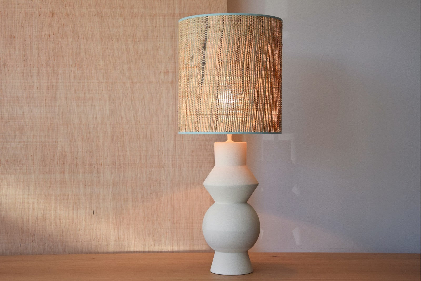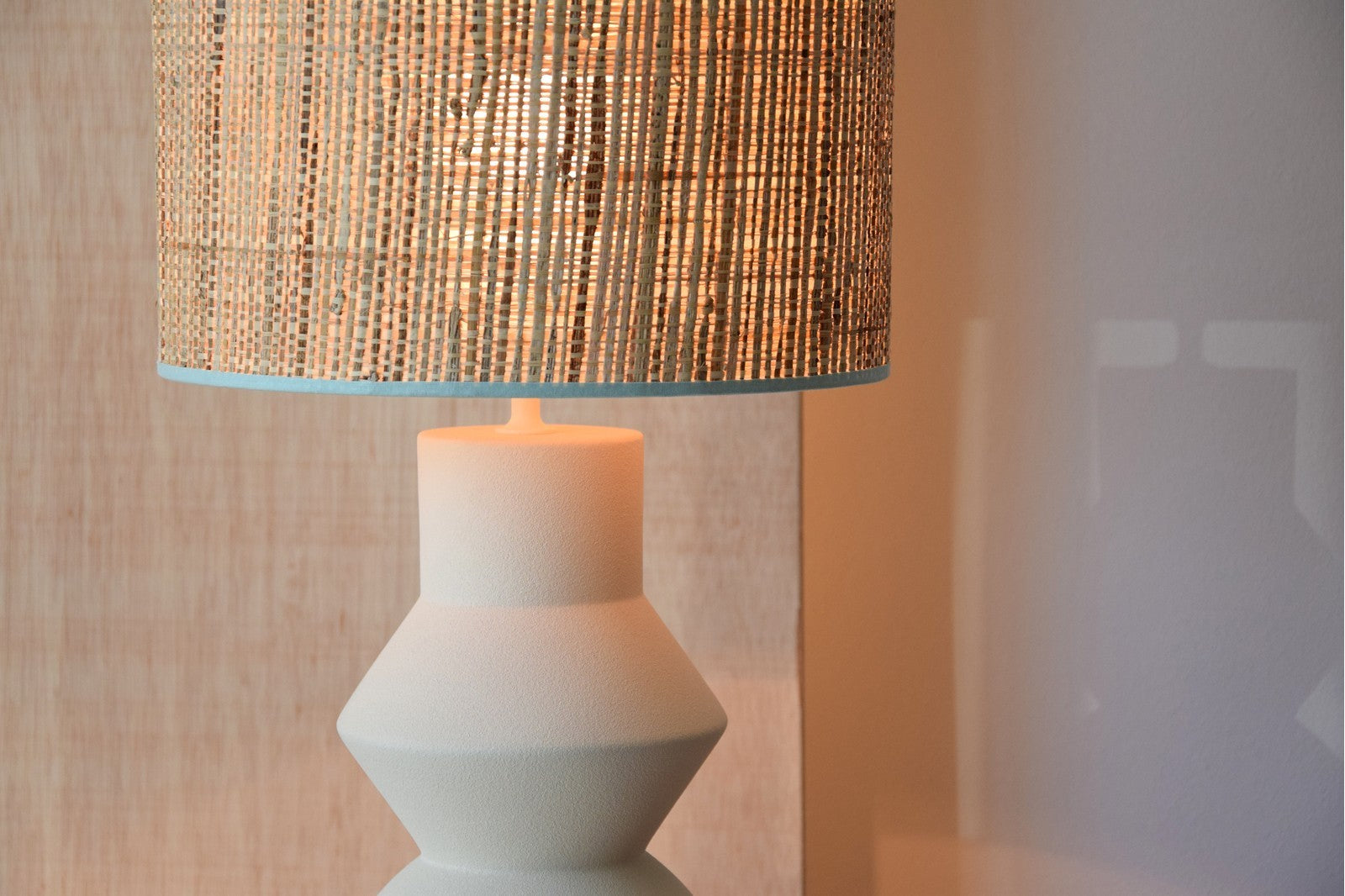 La lámpara de mesa Lichen Blanc combina una estética natural y serena con un diseño contemporáneo, destacando por su base cerámica en blanco crudo y su pantalla de rafia que aporta calidez y textura al conjunto.