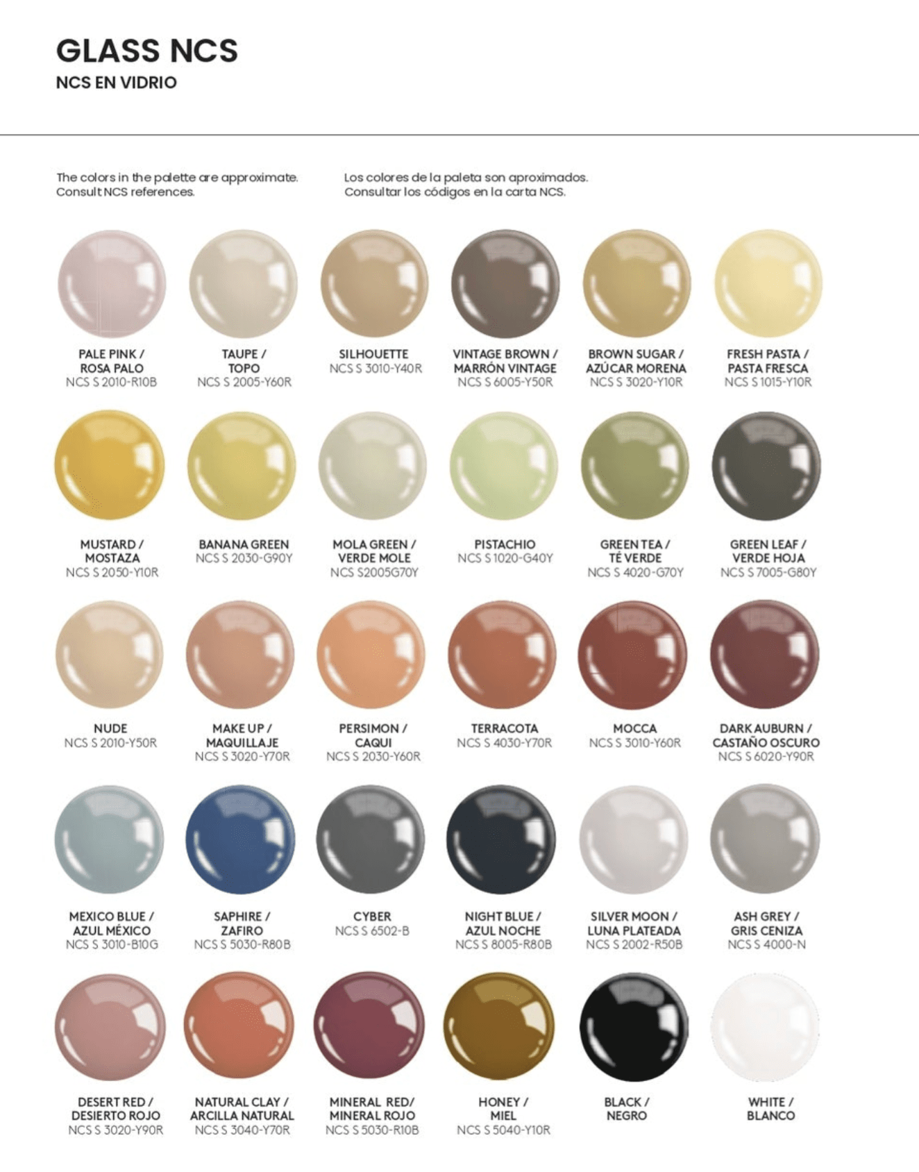 Los acabados del metal pueden elegirse en varios colores diferentes y la base de cerámica debe ser de alguno de los colores de la paleta. Si quiere algún color diferente a los de la paleta también podrá personalizar la lámpara.