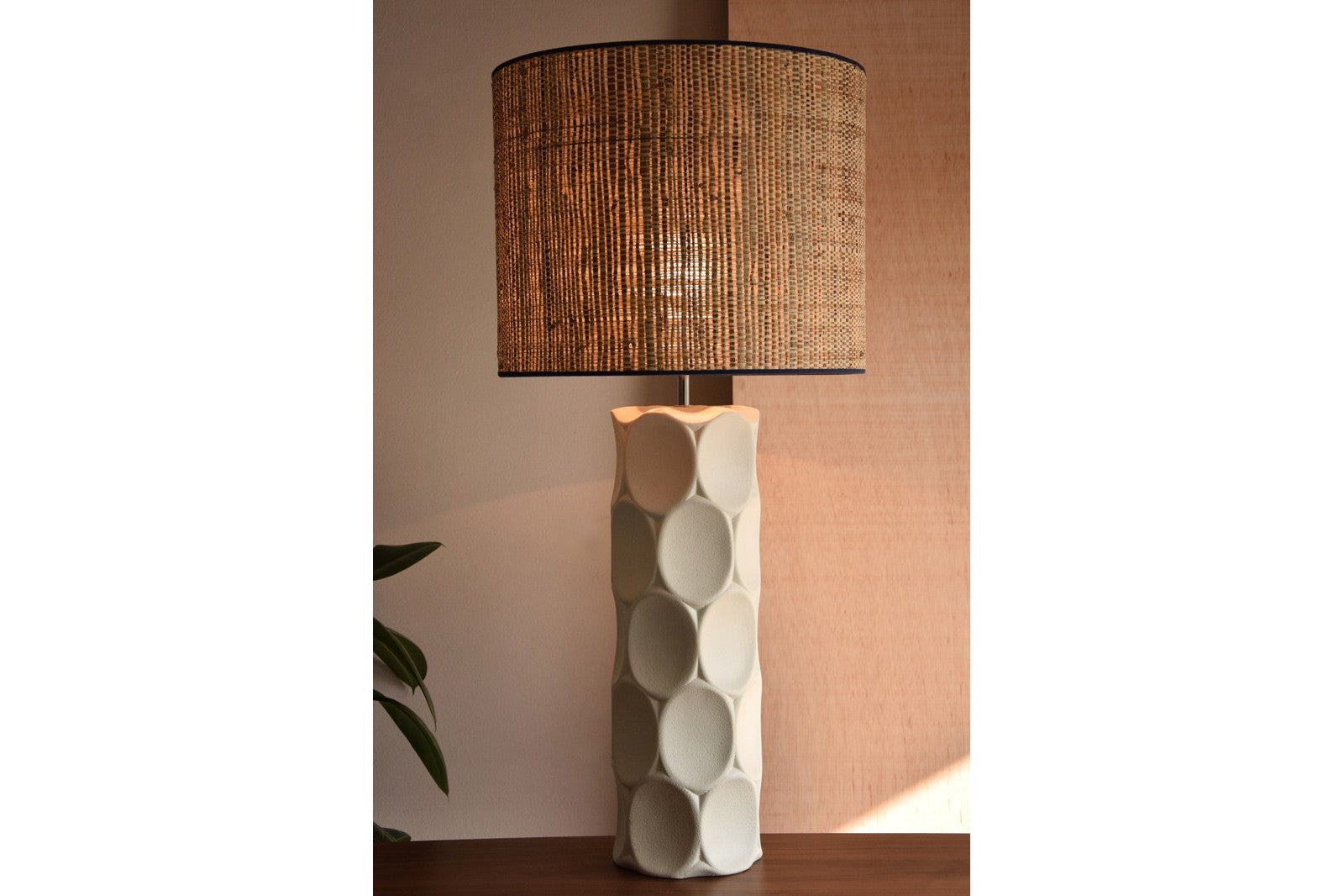 La lámpara de mesa Veinte Blanca destaca por su estilo artesanal y elegante, combinando cerámica blanca mate de textura rugosa con una pantalla de rafia natural que aporta calidez y naturalidad al espacio.