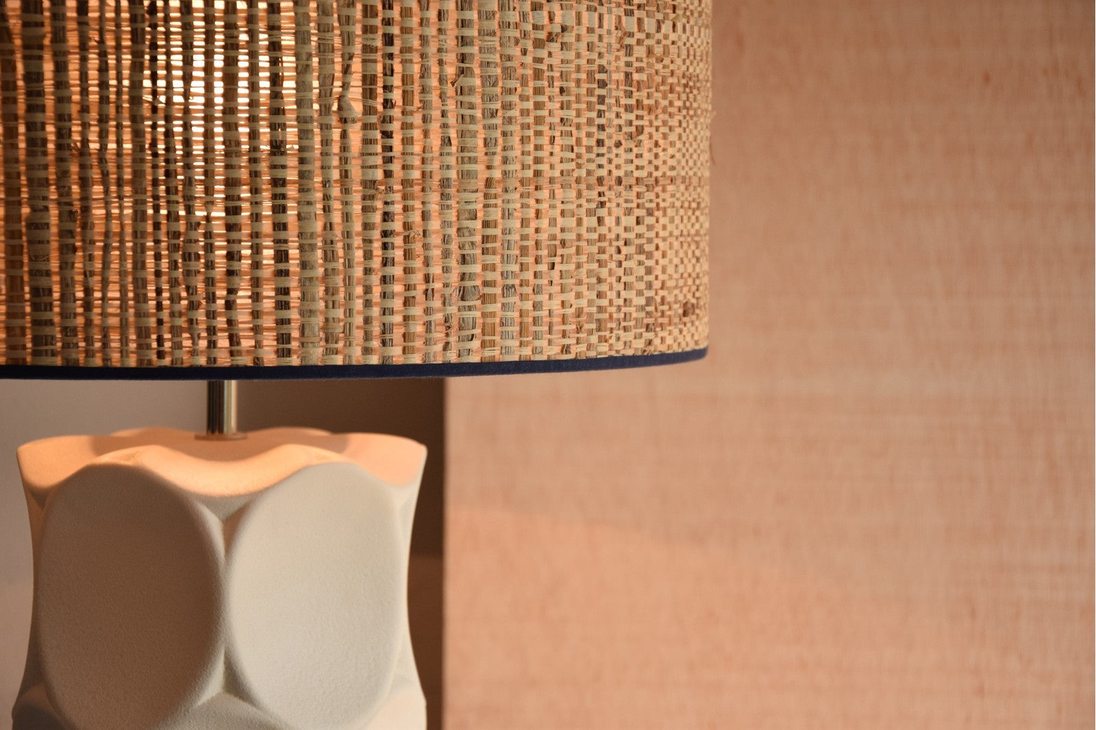 • Pantalla cilíndrica: realizada en rafia natural con vivos en azul oscuro que aportan contraste y estilo decorativo.