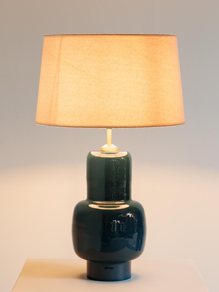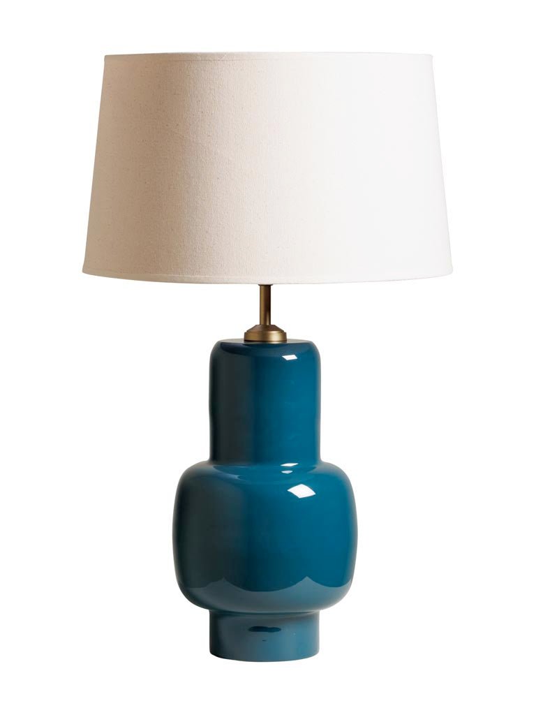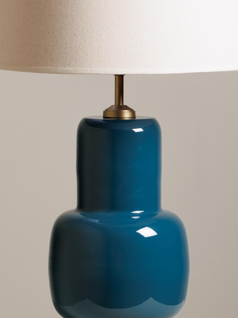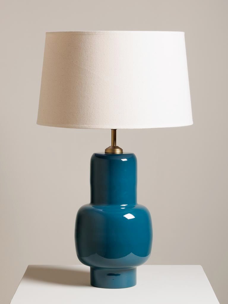 Preciosa lámpara de sobremesa fabricada en hierro color azul con pantalla en lino beige incluida.