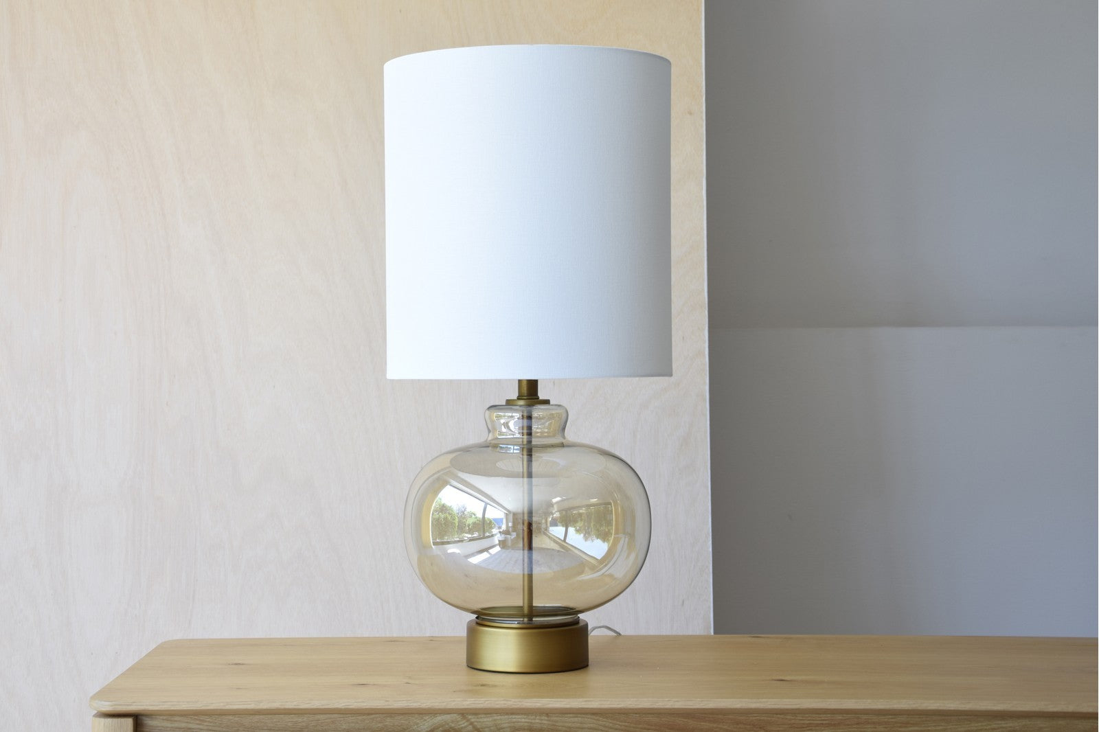 Lámpara de mesa Solán Ámbar, una pieza decorativa elegante y sofisticada realizada en vidrio soplado a mano en un cálido tono ámbar transparente. Su base metálica en acabado oro envejecido mate aporta estabilidad y un toque de lujo atemporal, mientras que la pantalla cilíndrica de algodón blanco roto suaviza la luz creando un ambiente acogedor.