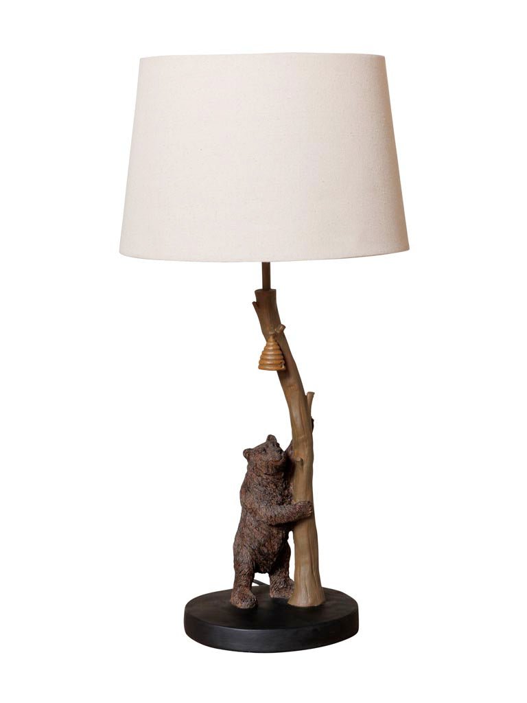 Preciosa lámpara de sobremesa fabricada en resina color marrón y negro con pantalla de algodón beige incluida.