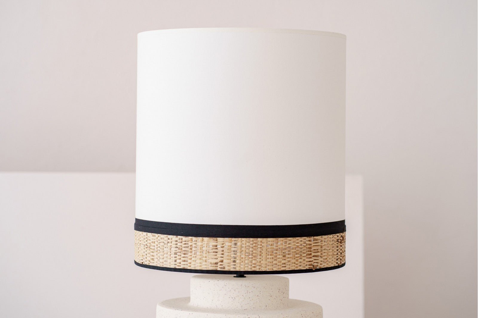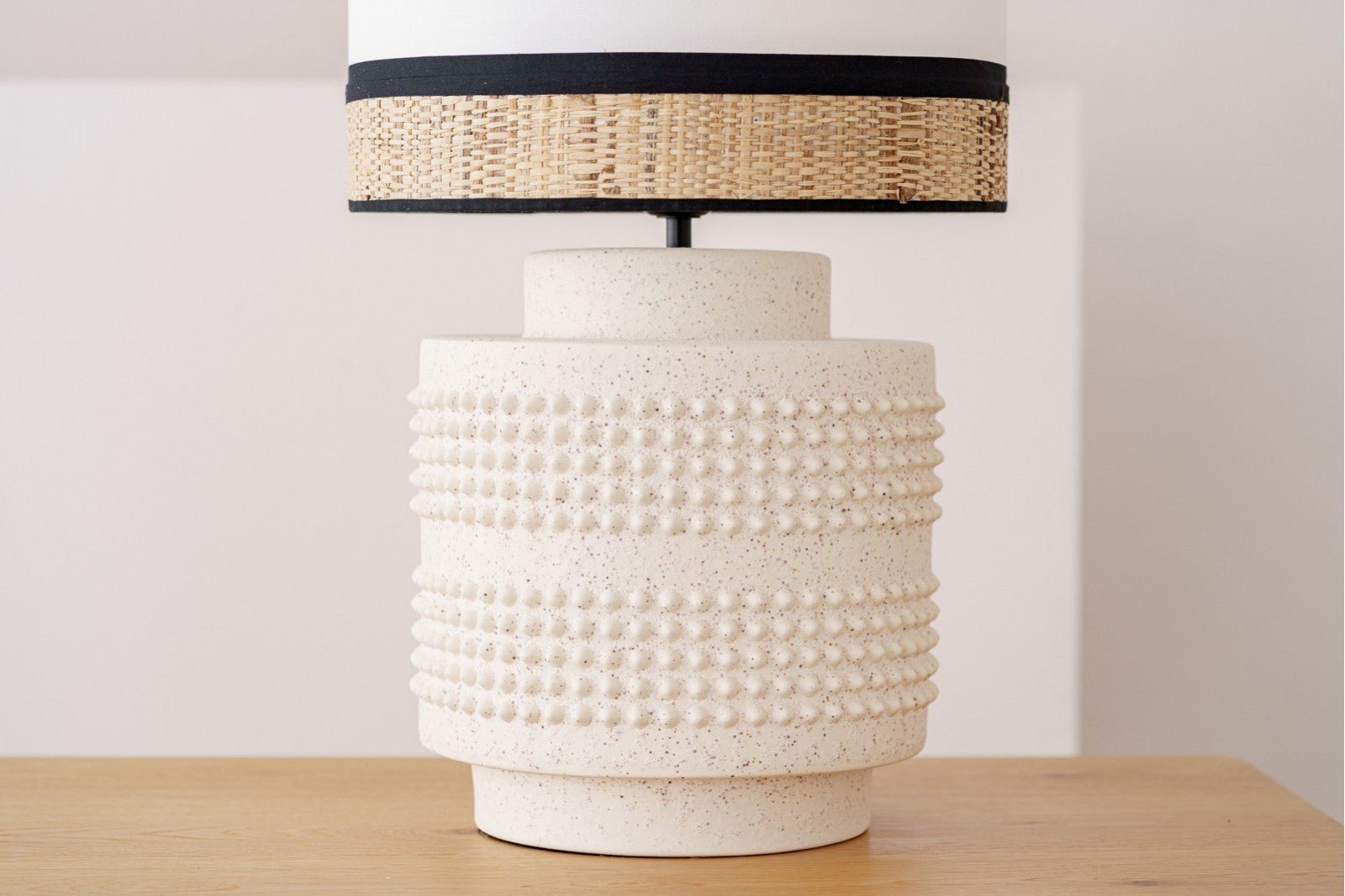 Lámpara de sobremesa realizada en cerámica de color blanco roto y pintas de tonos castaños, en su redondeada destaca su franja de relieve en picos. La pantalla es de forma cilíndrica. La pantalla cilíndrica realizada en algodón blanco roto con vivo inferior de 6 cm en rafia natural y vivo de unión en negro.