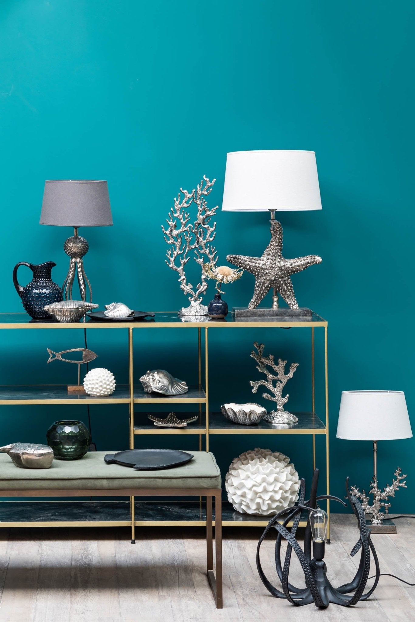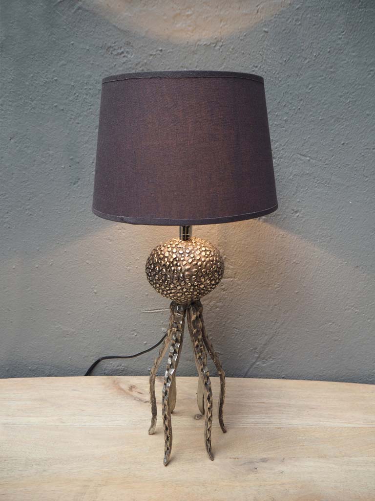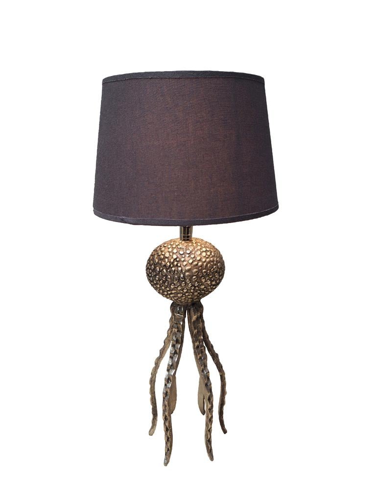 Preciosa lámpara de sobremesa con pie en forma de pulpo fabricado en aluminio color plateado con pantalla de lino gris incluida.