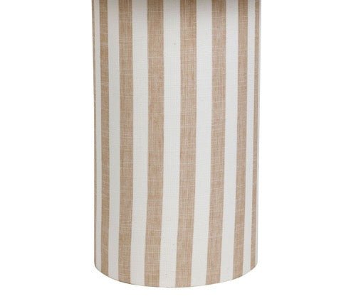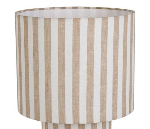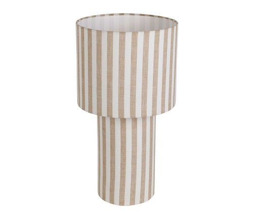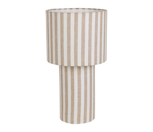 Lámpara de sobremesa de tela decorada con rayas en tonos natural y gris topo, un diseño elegante y atemporal que se adapta a distintos estilos de interior. Su luz cálida y suave crea un ambiente acogedor, ideal para salones, dormitorios o espacios de lectura. Una pieza versátil que combina funcionalidad y estilo, aportando un toque de sofisticación discreta al hogar.