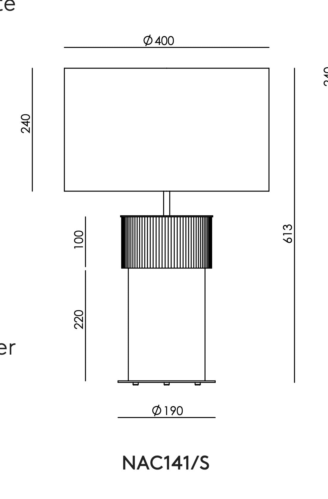 Diámetro (sin pantalla): Ø19 cm. Diámetro (con pantalla): Ø40 cm. Alto de la base: 32 cm. Alto total: 61,3 cm