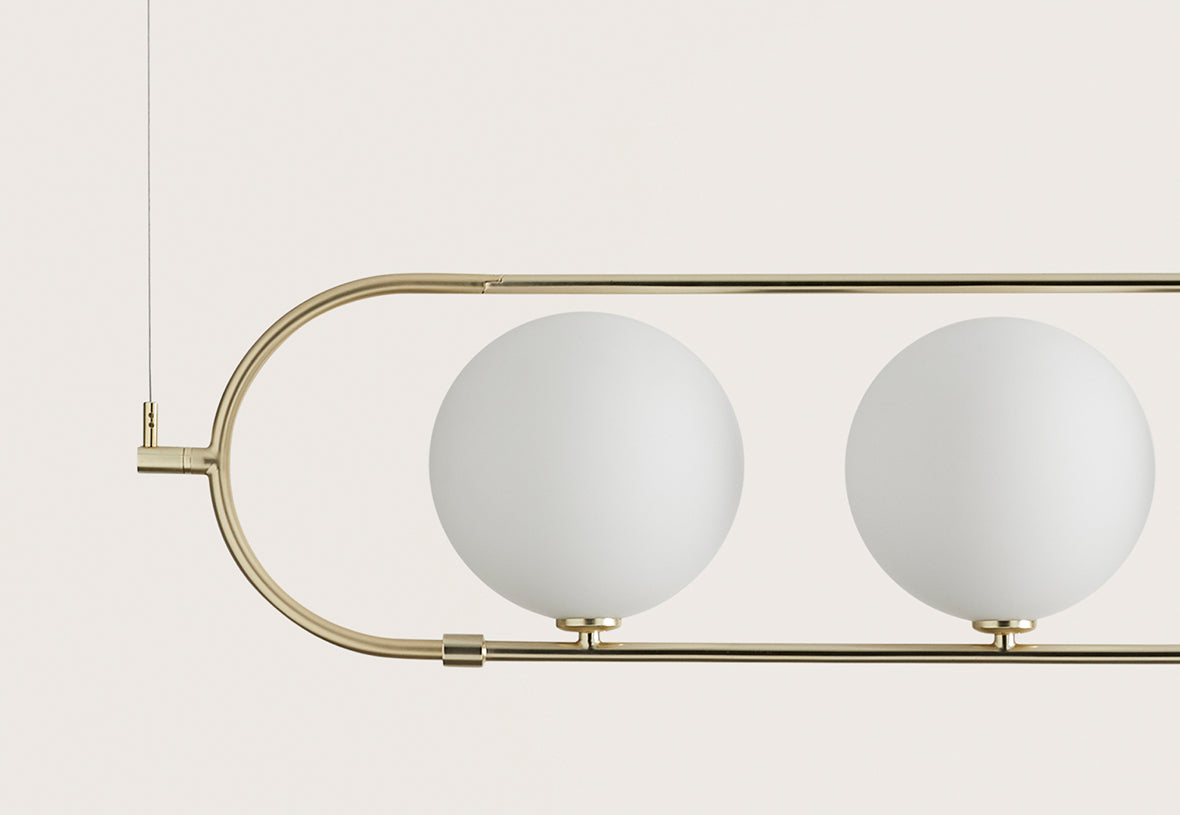Lámpara de techo de diseño fabricada en acero y vidrio soplado con altura regulable. Las tulipas, que están incluidas, son de cristal opal o transparente, y el cuerpo de acero está disponible en color negro mate y oro mate.