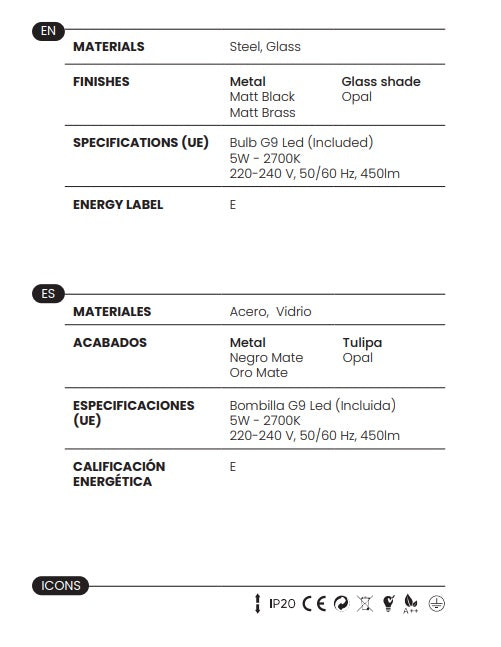 Bombilla: G9 LED 5W 2.700K 450lm. Incluida.