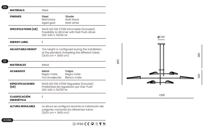 Bombilla: 6xG9 LED 5W. 2700K. Son regulables y están incluidas.