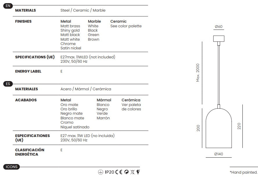 - Materiales: Metal (Acabado a elegir) y cerámica (Color a elegir).