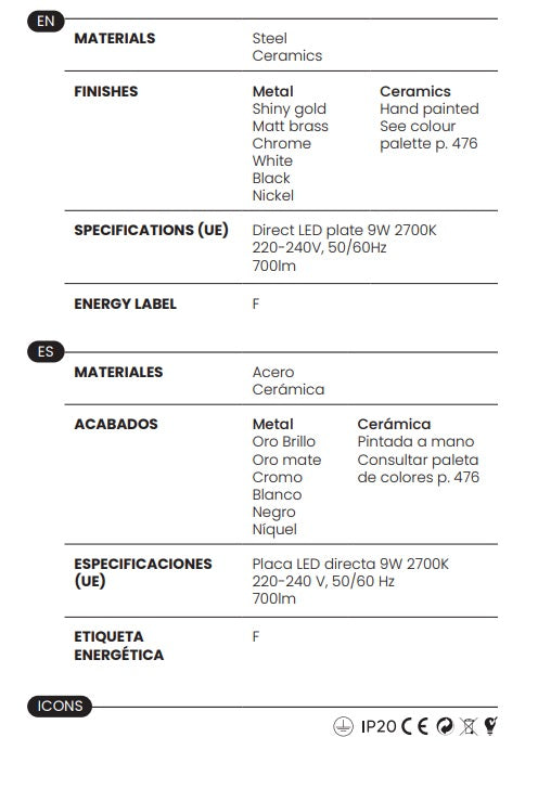 Tanto la estructura de acero como la tulipa cerámica pueden elegirse en distintos colores según la paleta mostrada en las imágenes, o bien indicar un código de color propio si se desea una personalización específica.