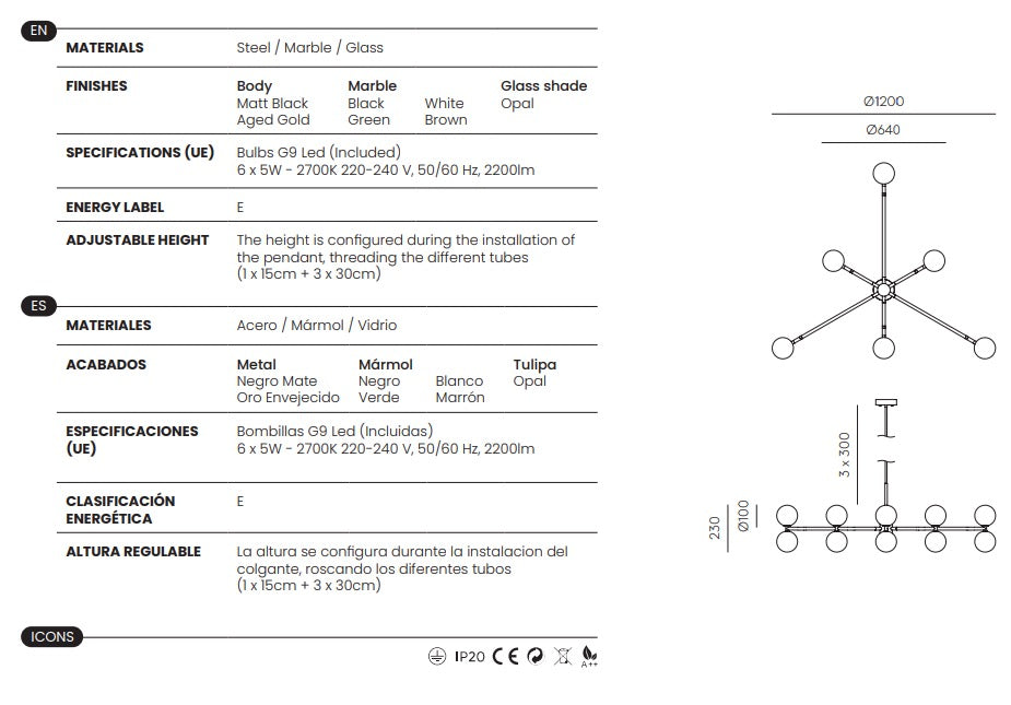 - Fuente de luz: 6 x G9 LED 5W 3000K (incluidas).