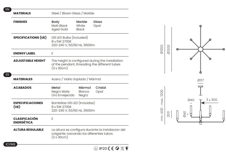 Bombilla: 8 x G9 5W 2.700K. Incluidas. Posibilidad de regulación con sobrecoste.