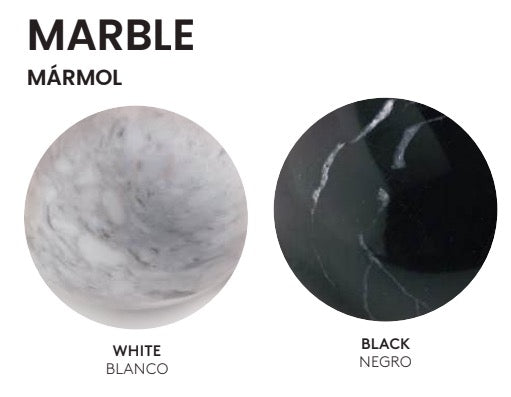 Lámpara de techo de diseño con 8 puntos de luz fabricada en acero, mármol y vidrio soplado. Las tulipas son de cristal opal y esferas decorativas de mármol. La estructura está disponible en dos acabados diferentes: