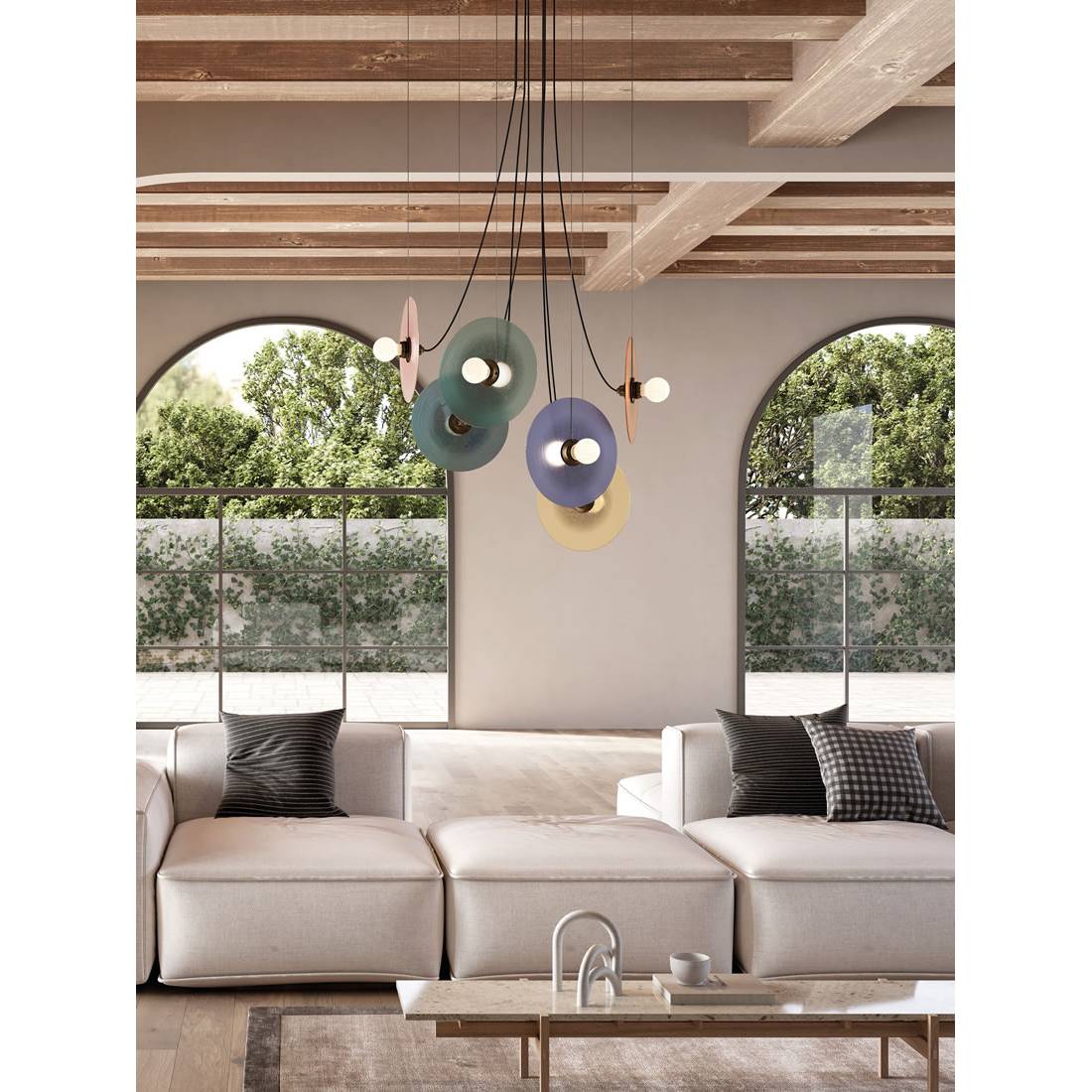 Lámpara de techo de diseño fabricada en acero, vidrio y cable textil. Los discos de vidrio de colores son de Ø25 cm. Cuenta con seis puntos de iluminación en forma de platillo, y cada uno de ellos en un color distinto.