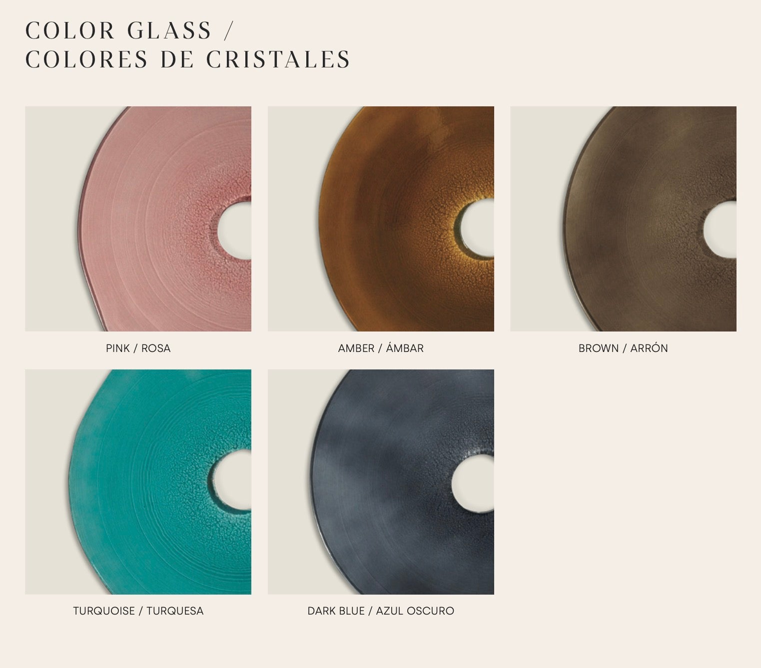 Colores de los discos de cristal: Por omisión, los colores son turquesa, ámbar, rosa, azul oscuro y marrón, pero existe la opción de personalizar los colores e incluso añadir un disco de color transparente. Para ello deberá ponerse en contacto con nosotros por email (info@pinoyjacaranda.com) y especificárnoslo.