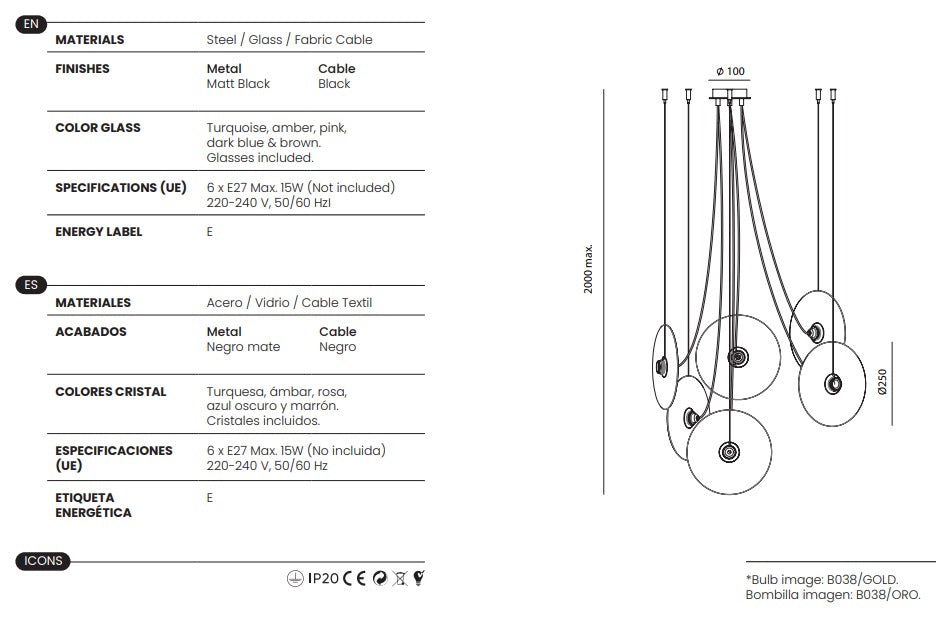 Bombillas: 6 x E27 (no incluidas). Debe seleccionar la opción correspondiente para agregarlas. Más información sobre el tipo de bombilla recomendada aquí.