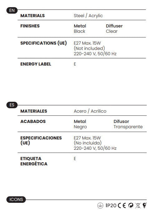 Lámpara de techo de diseño fabricada en acero de color negro, tulipa con diseño cilíndrico y difusor acrílico de color transparente.