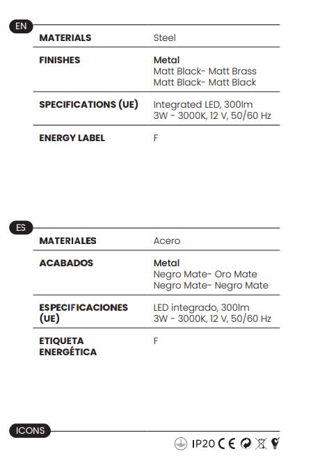 Con iluminación LED integrada y no reemplazable, el cable es de color negro, y el detalle de la tulipa de metal puede ser de color oro mate o negro.