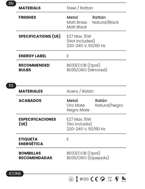 Cuenta con una bonita pantalla de ratán en color natural o negro. Su diseño entrelazado deja pasar la luz por los huecos, creando un efecto de iluminación diferente.