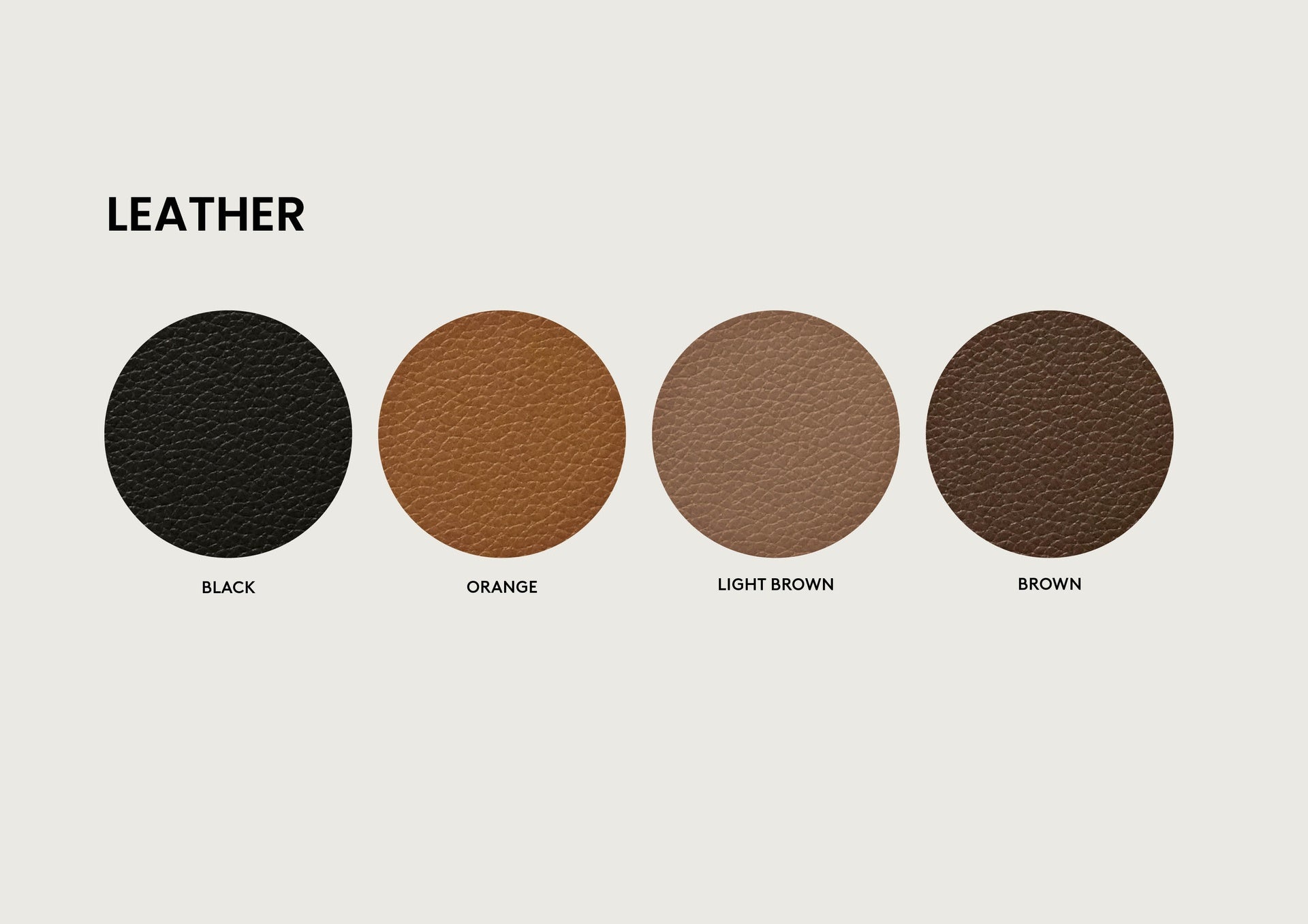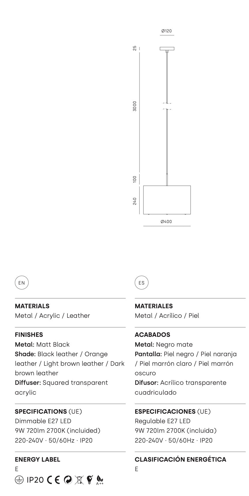 Lámpara de techo de diseño colgante con estructura de acero en color negro mate y pantalla de cuero en varios posibles colores.