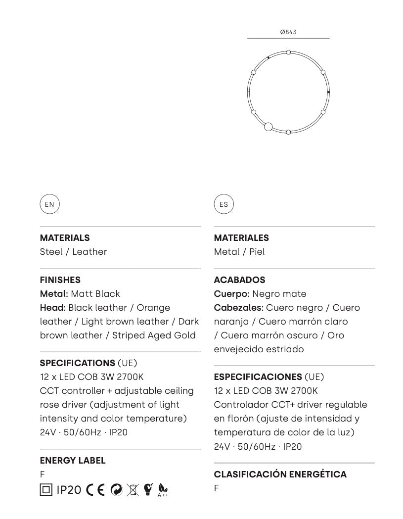 Bombilla: LED COB regulable. Controlador CCT + driver regulable en el florón (ajuste de intensidad y temperatura de color de la luz). 3W - 2.700K - 210lm.