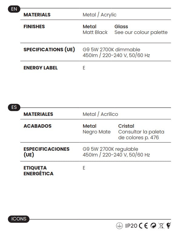 - Iluminación: Bombilla G9 de 5W incluida, 2700K (Luz cálida), regulable.
