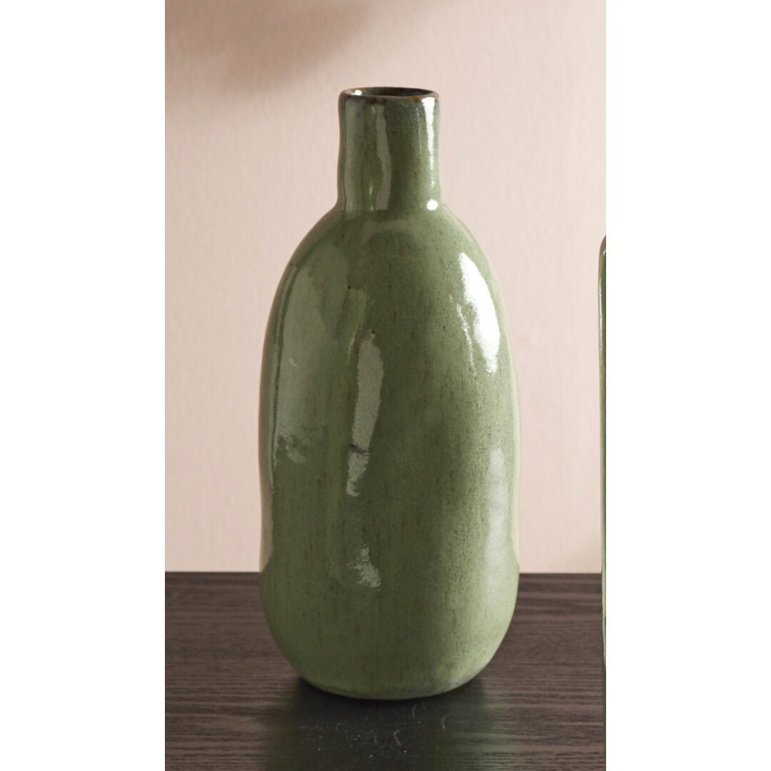 Jarrón fabricado en cerámica color verde. Disponible en tres formas y medidas diferentes.