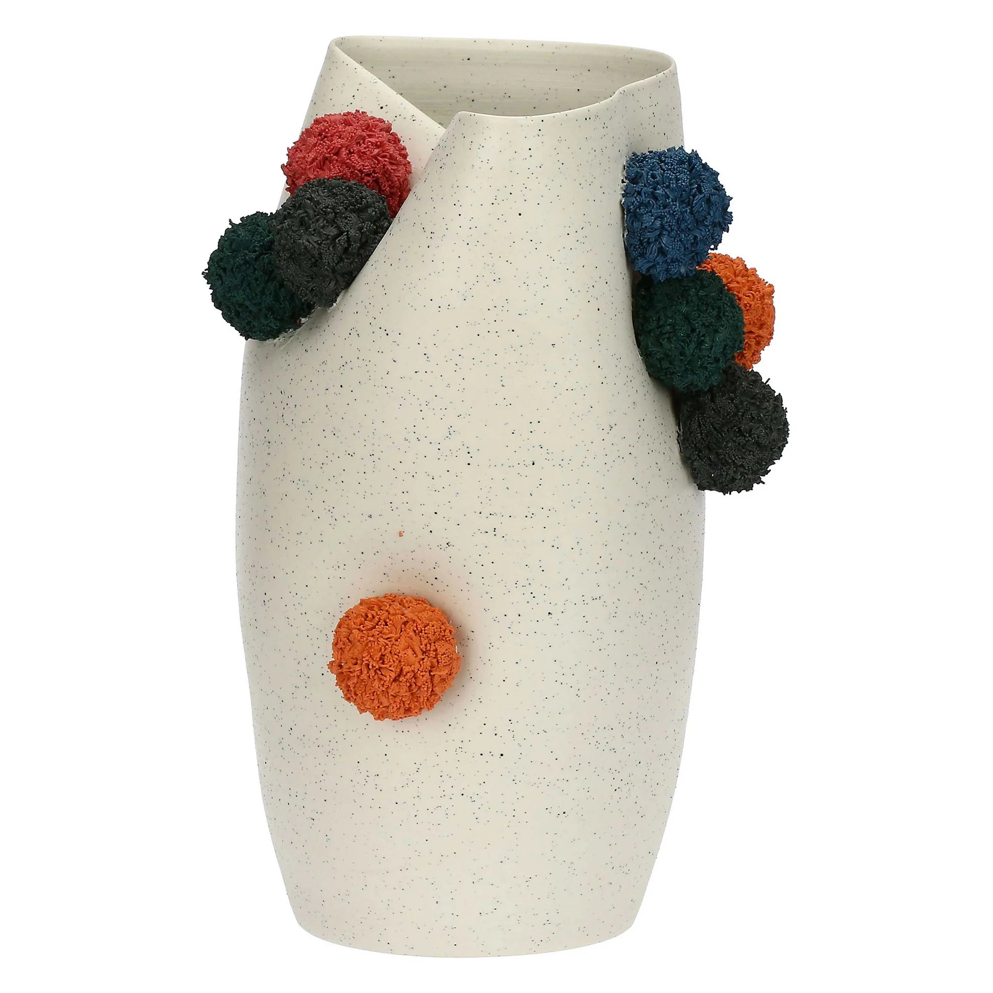 Aporta un toque alegre y original a tu decoración con este jarrón de cerámica en tono crema, adornado con encantadores pompones de colores. Su diseño combina la suavidad y elegancia del acabado cerámico con un aire divertido y artesanal, ideal para dar vida a cualquier rincón del hogar. Perfecto para flores secas, frescas o simplemente como pieza decorativa, este jarrón une creatividad, color y estilo contemporáneo en un solo objeto.