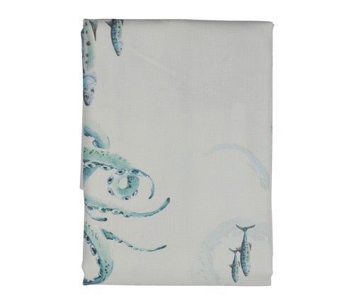Transforma tu mesa con el encanto del océano. Este mantel de algodón presenta un alegre diseño de pulpos y peces en tonos blanco y turquesa, evocando la frescura del mar y el espíritu del verano. Su tejido natural y suave lo hace ideal para el uso diario o para vestir tu mesa en reuniones informales con un toque costero y original. Disponible en dos tamaños: