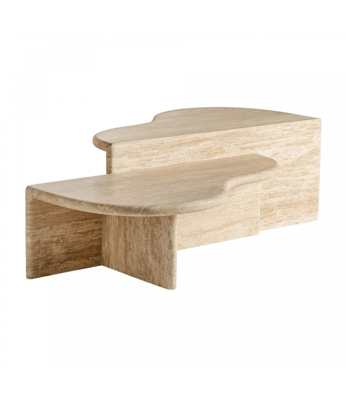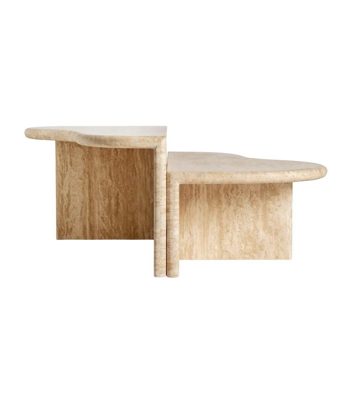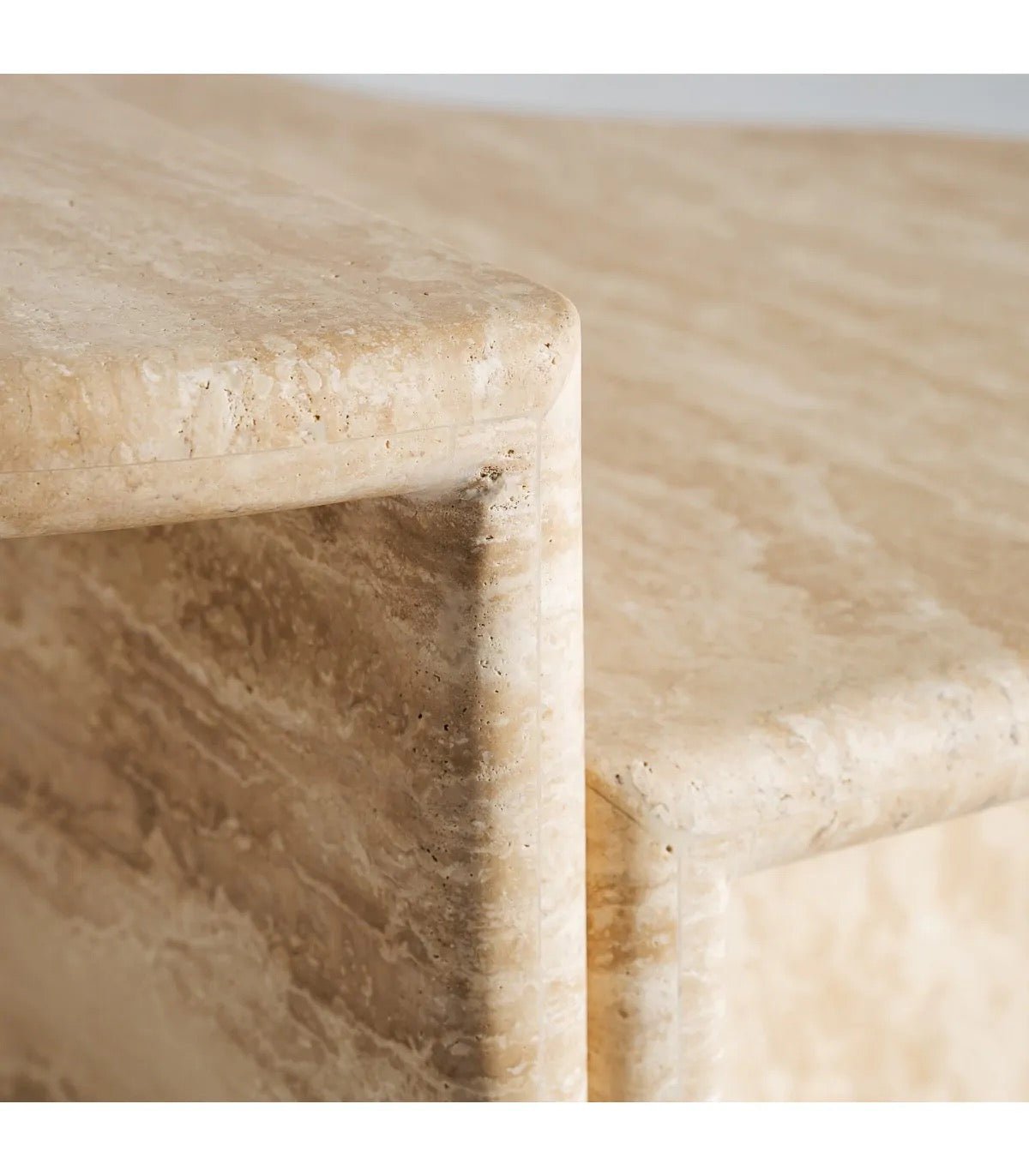 Juego de 2 mesas de centro de estilo art deco, fabricado en travertino en color marrón claro.